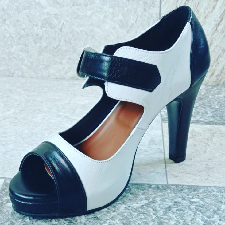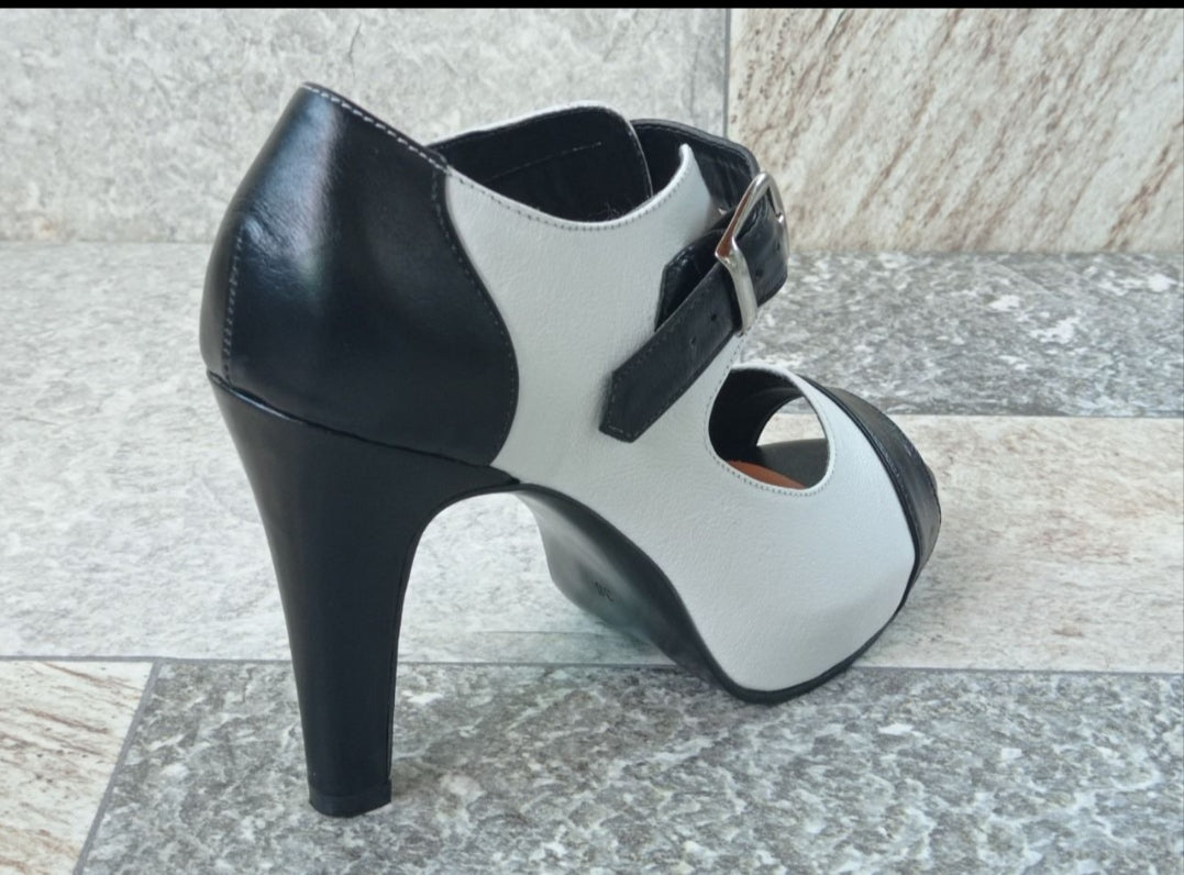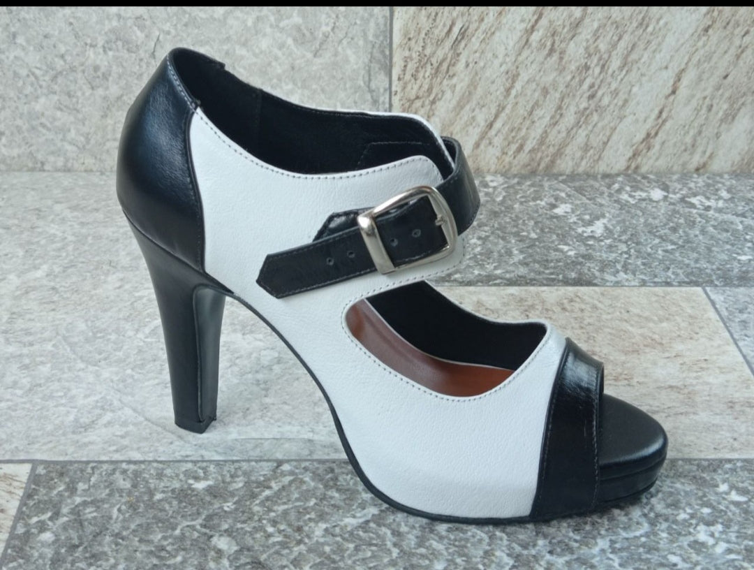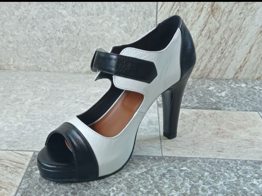 Sandália em couro com saltos semi agulha de 10cm traseiro e meia pata de 3 cm frontal , feixo lateral , toda forrada internamente que proporciona maior conforto. Produzida sob pedidos podendo ser nas cores ( vermelho c/preto)