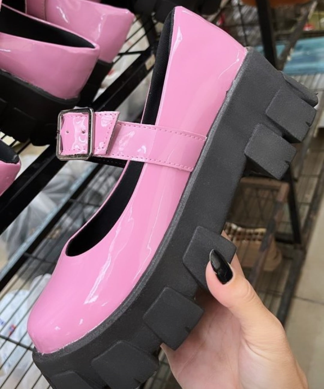 Sandália em courino verniz modelo boneca com solado Tratorado emborrachado anti derrapante com altura de 6cm , fivela com feixo na parte superior .