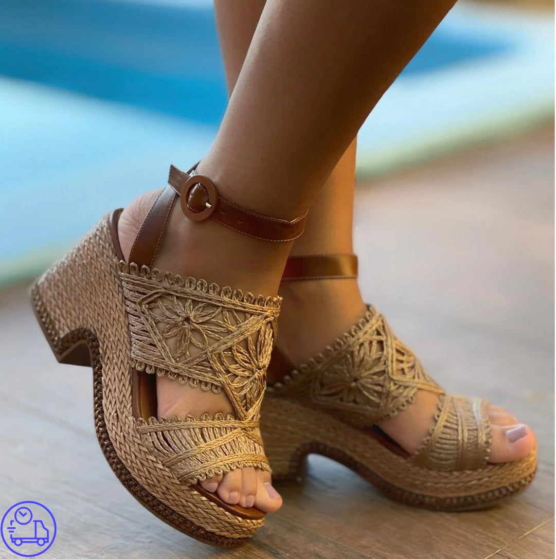 Sandália Em palha trançada modelo crochê na parte superior com tiras de feixo em couro e solado em PU forrado, excelente qualidade, leve e bem estruturada.