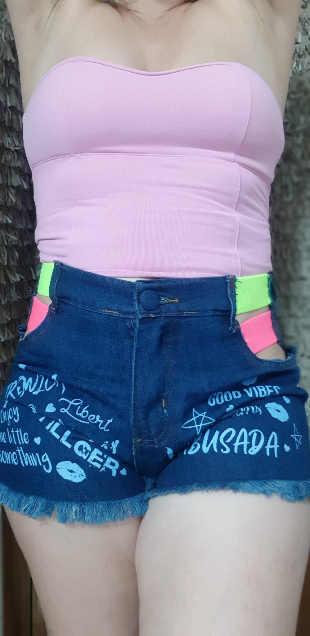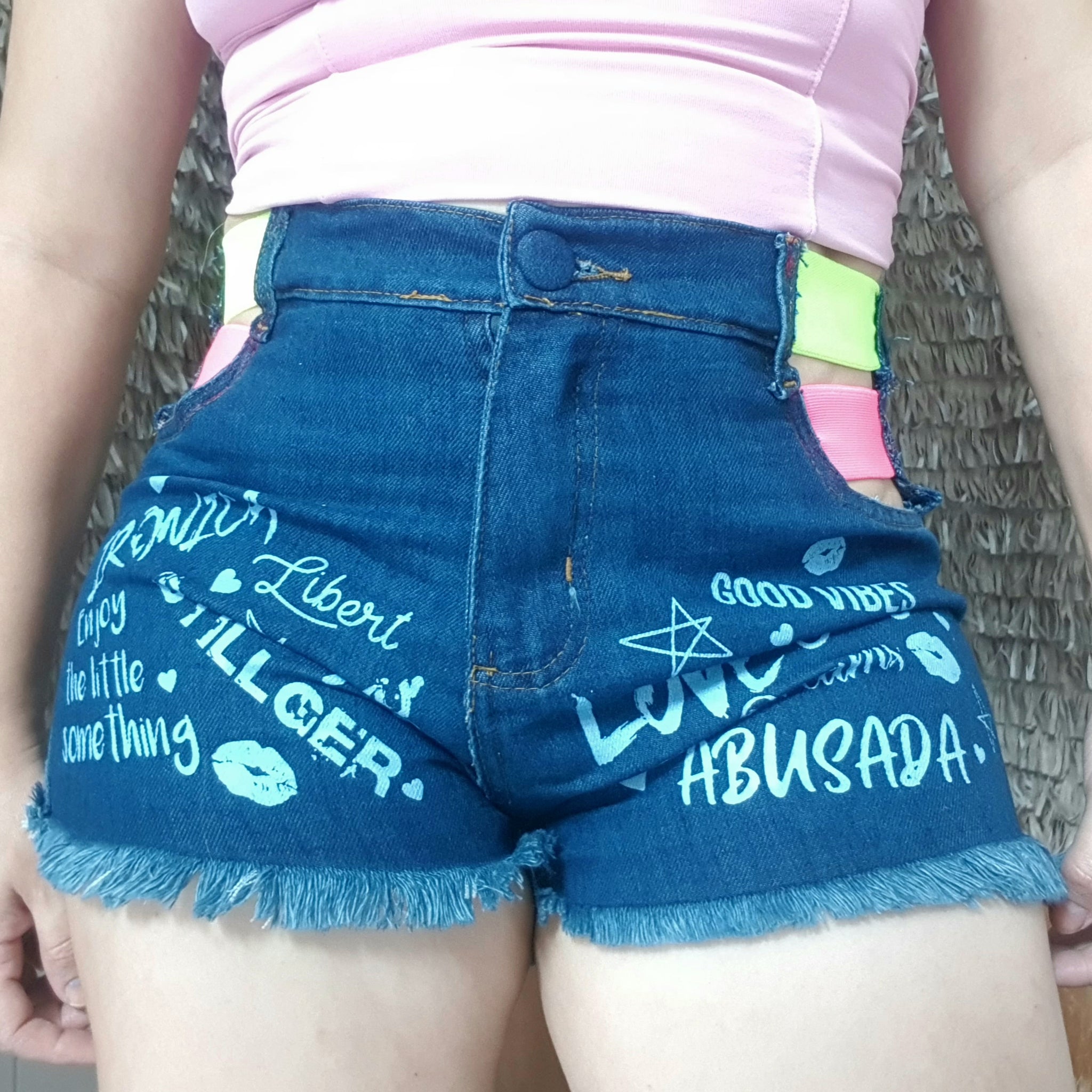Shorts em jeans molinho 100% algodão pintado e customizado, com na altura do umbigo , lavagem escura , elástico laterias , (pode usar calcinha). Modelo está vestindo 44