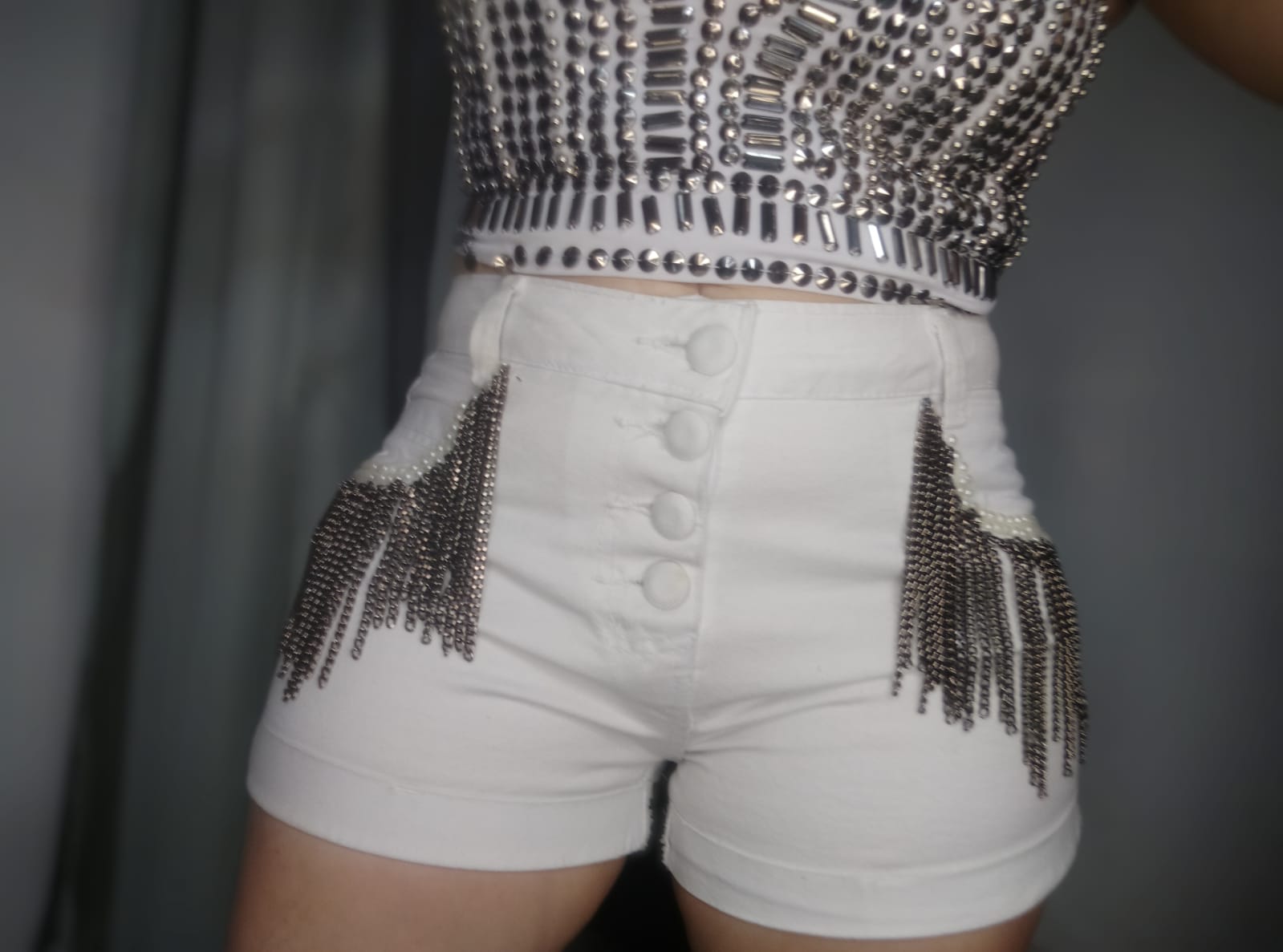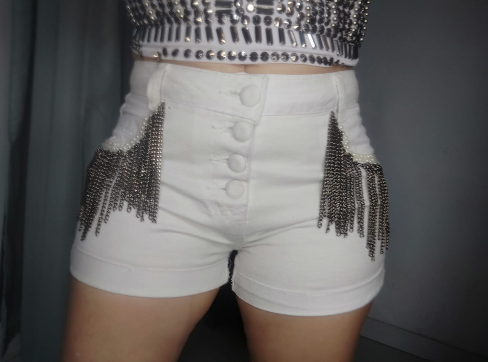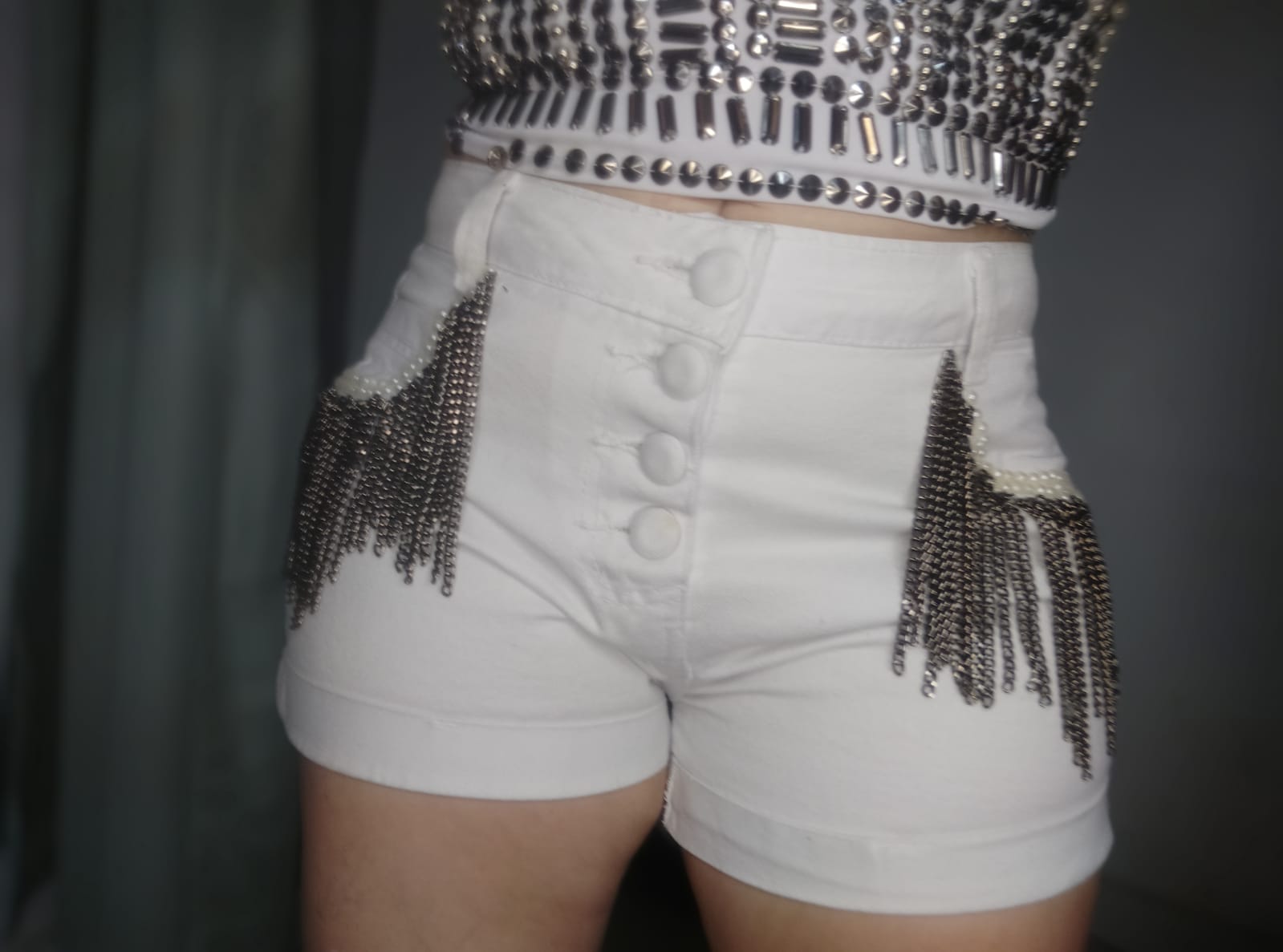 Shorts em brim sem elastano, 100% algodão com customização frontal em correntes costuradas e pérolas aplicadas .