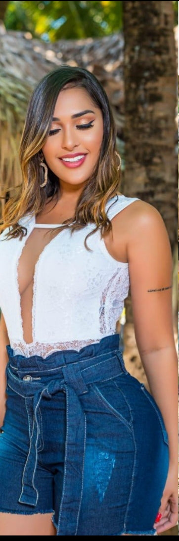 Short clochard no jeans escuro jeans com lycra super-resistente veste super bem levemente destróyed desfiado na Barra com bolsos frontais e bolso traseiro faixa na cintura para amarração veste muito bem