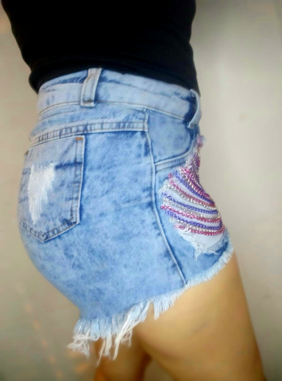 Shorts Jeans sem elastano lavagem marmorizada com customização frontal em correntes niquelado não inferrujam, cores intensas.