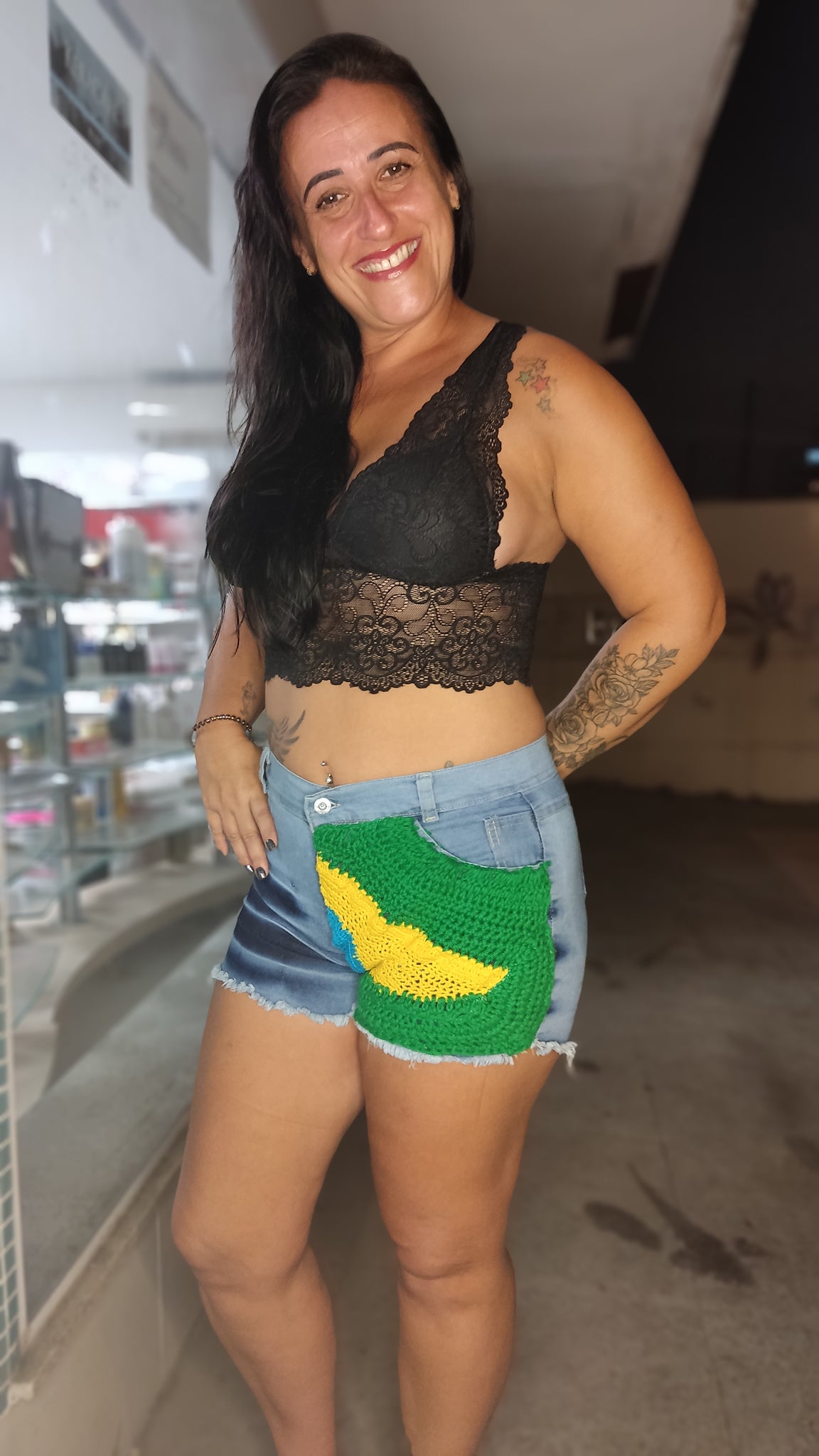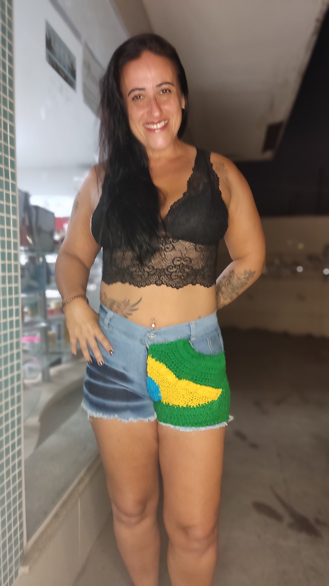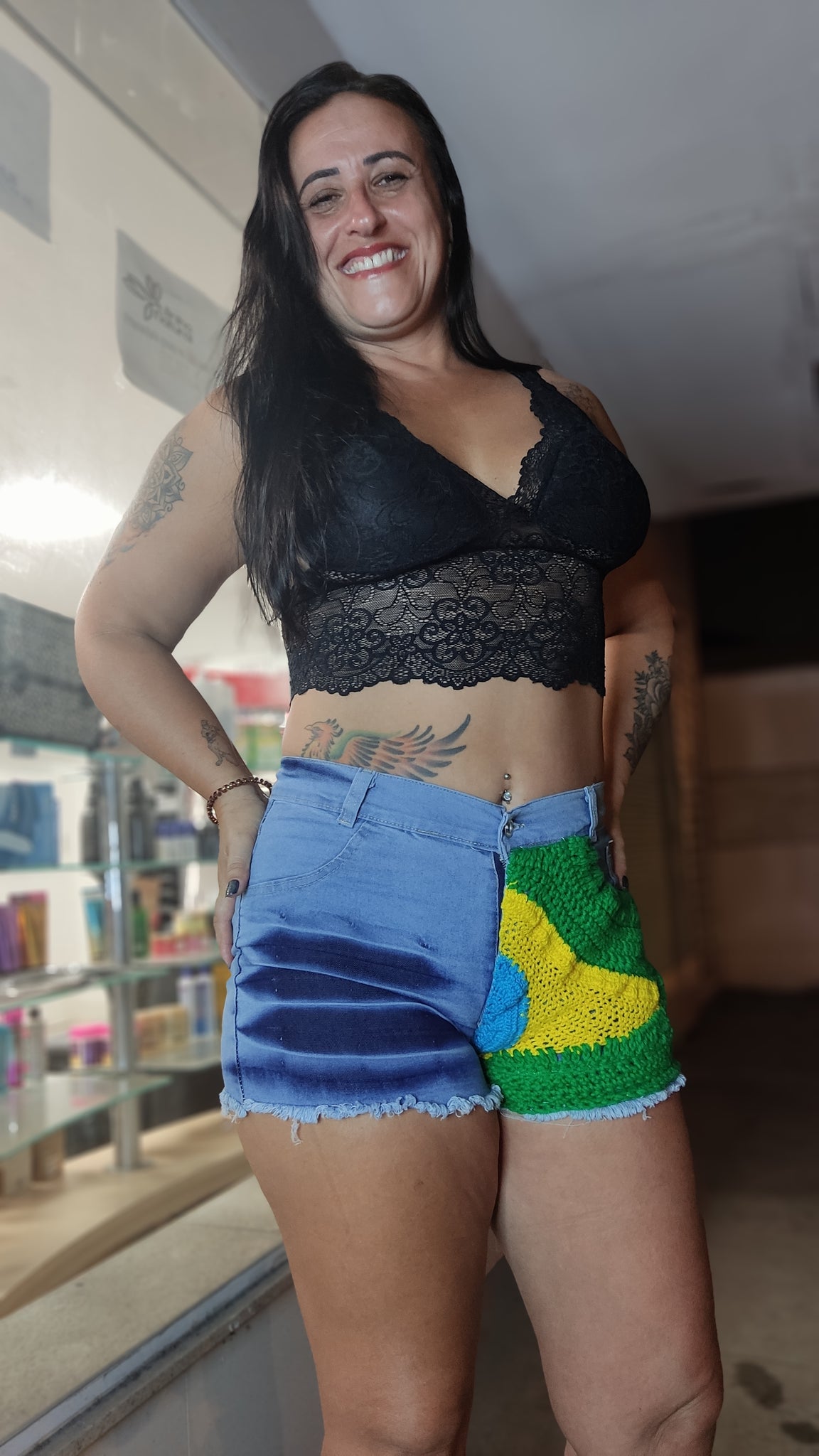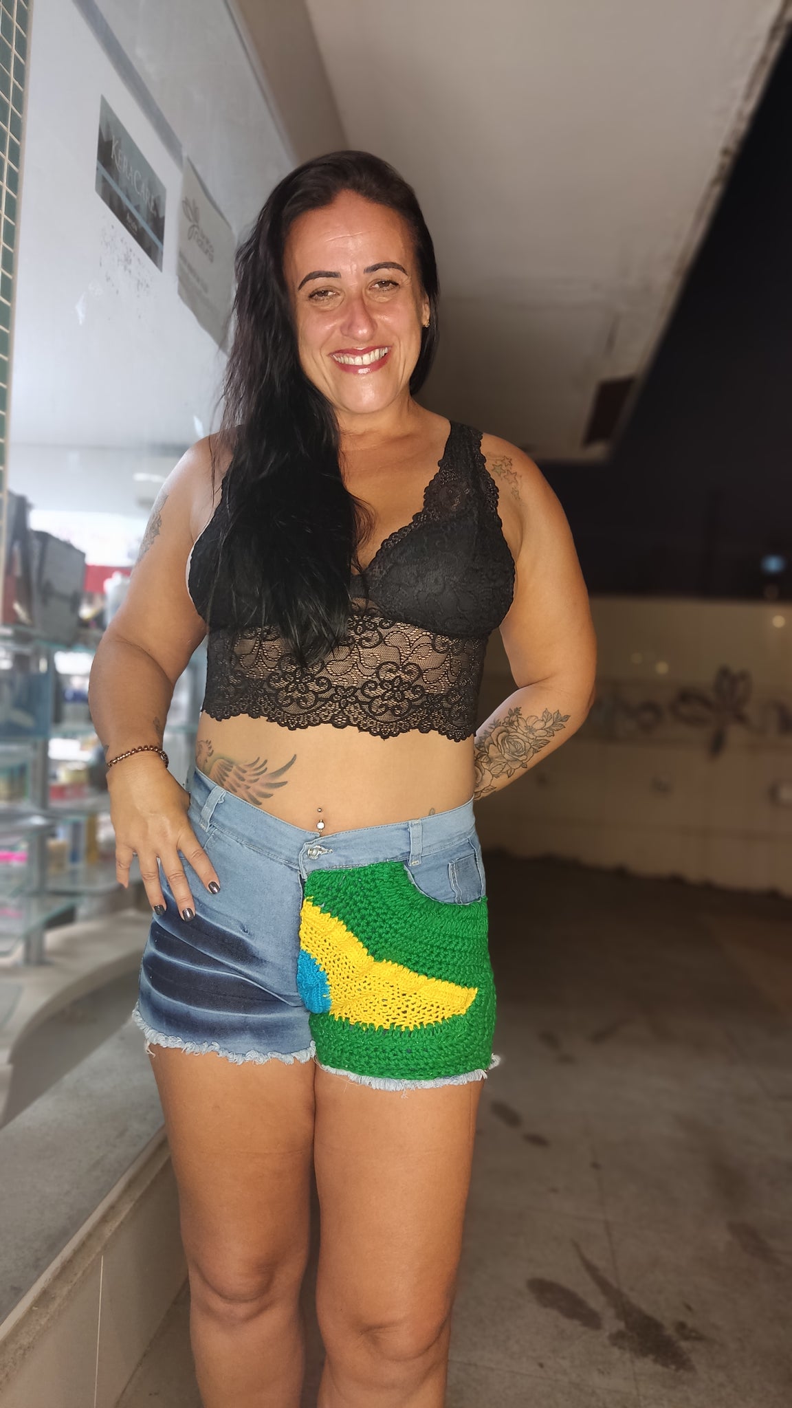 Shorts em jeans com elastano customizado em tricô , cóz alto , modelo exclusivo pode haver variações na lavagem do Jeans.