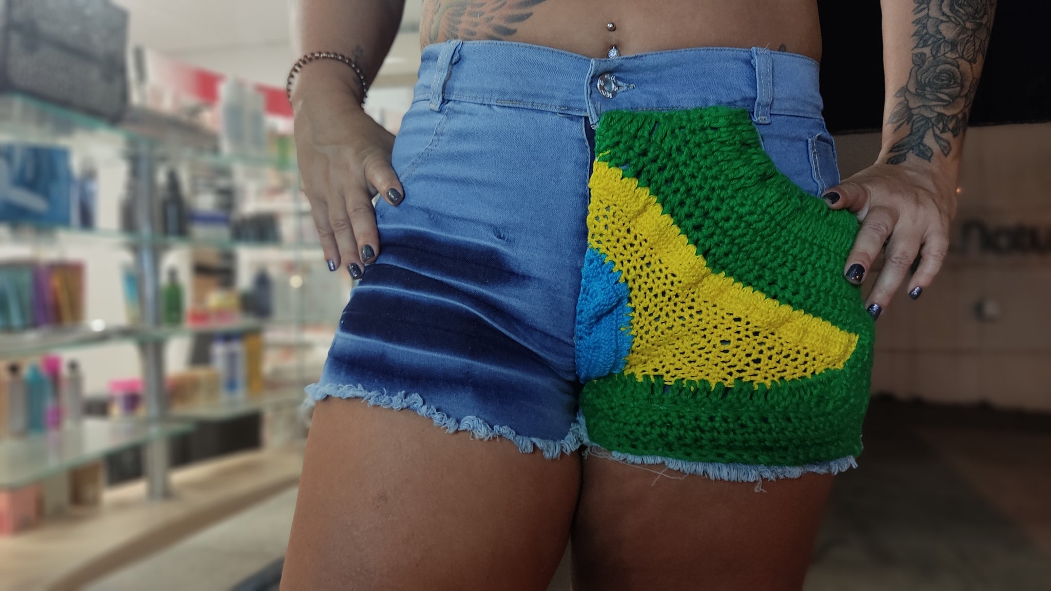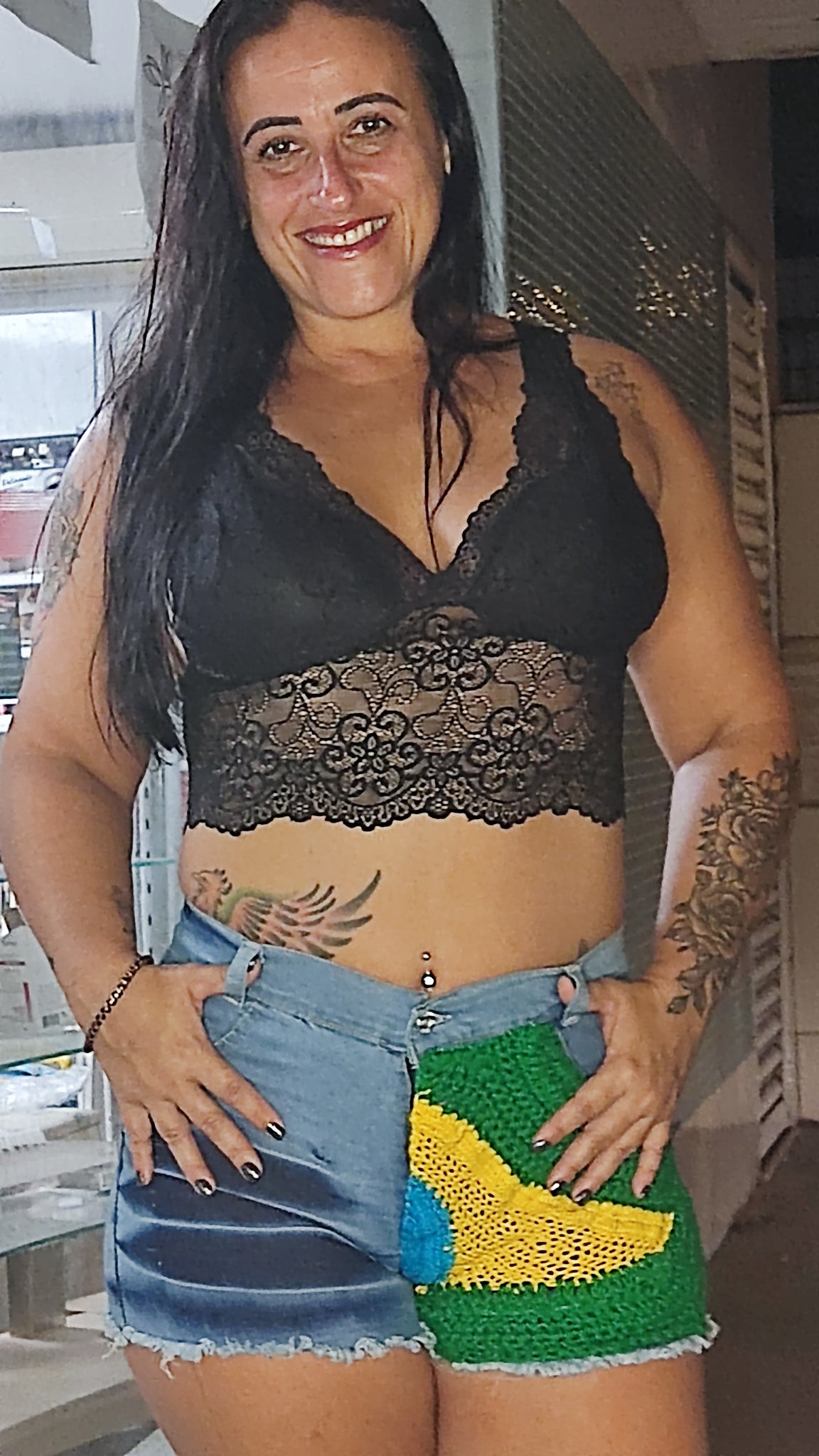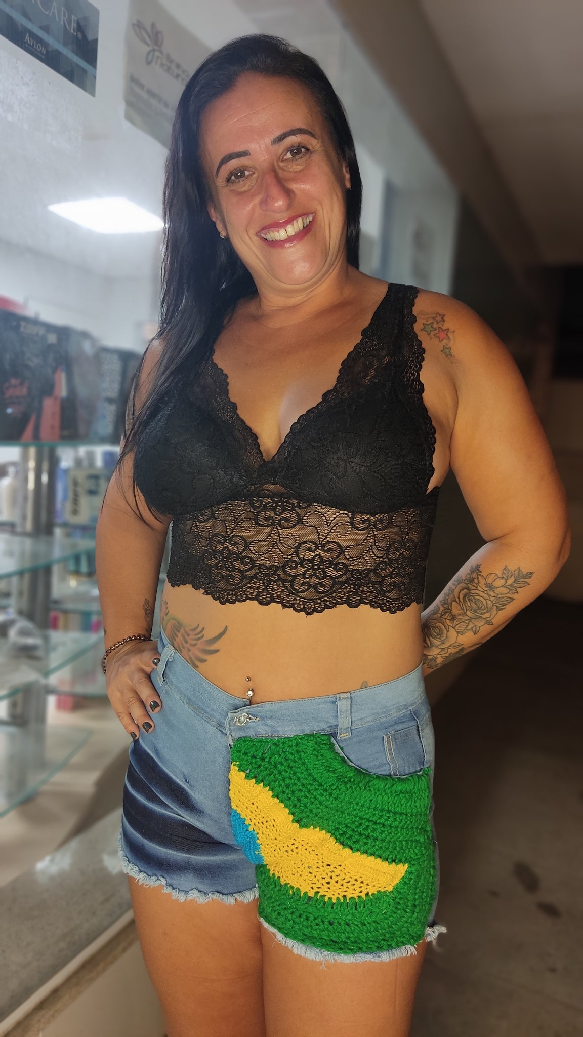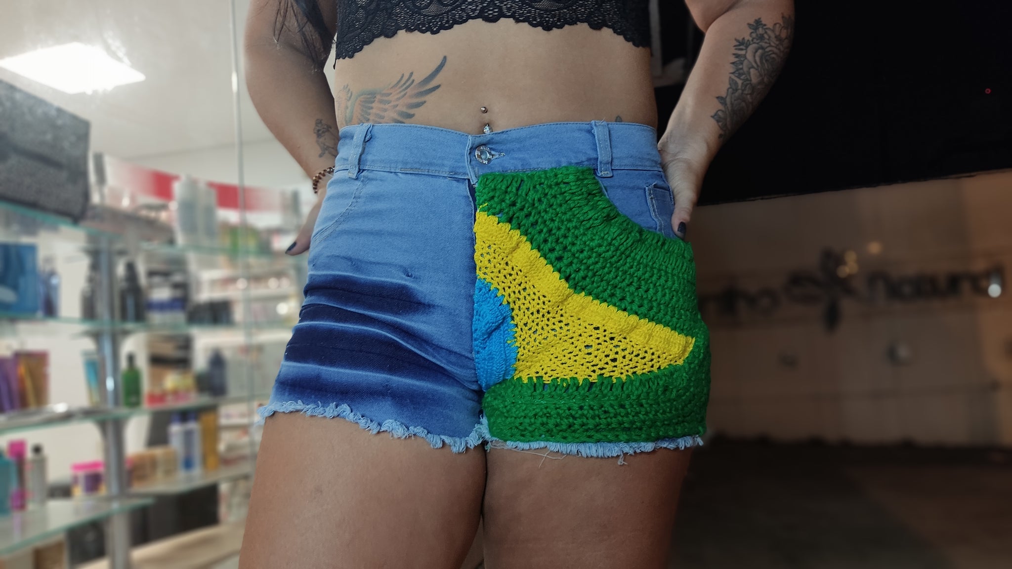 Shorts em jeans com elastano customizado em tricô , cóz alto , modelo exclusivo pode haver variações na lavagem do Jeans.