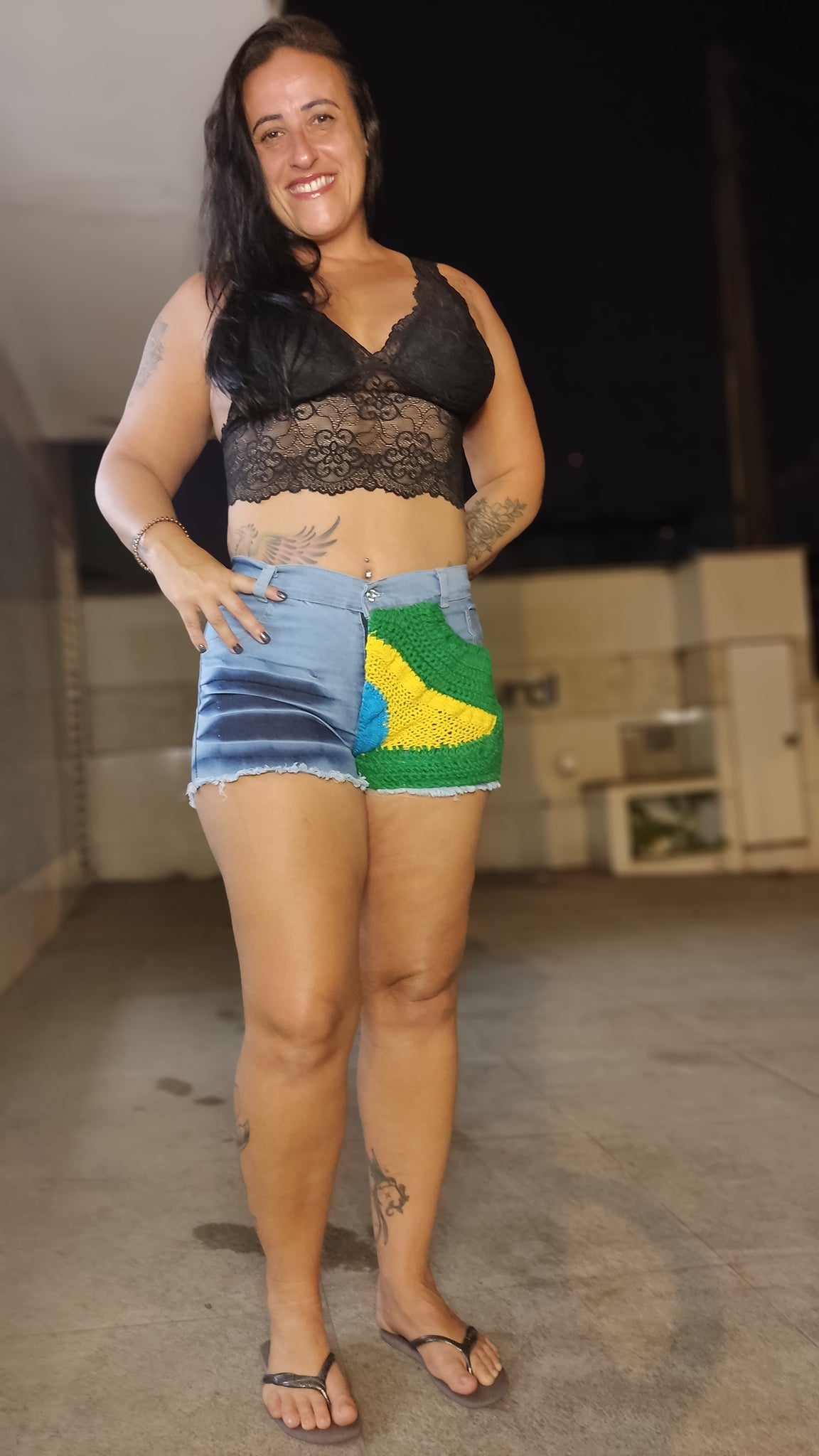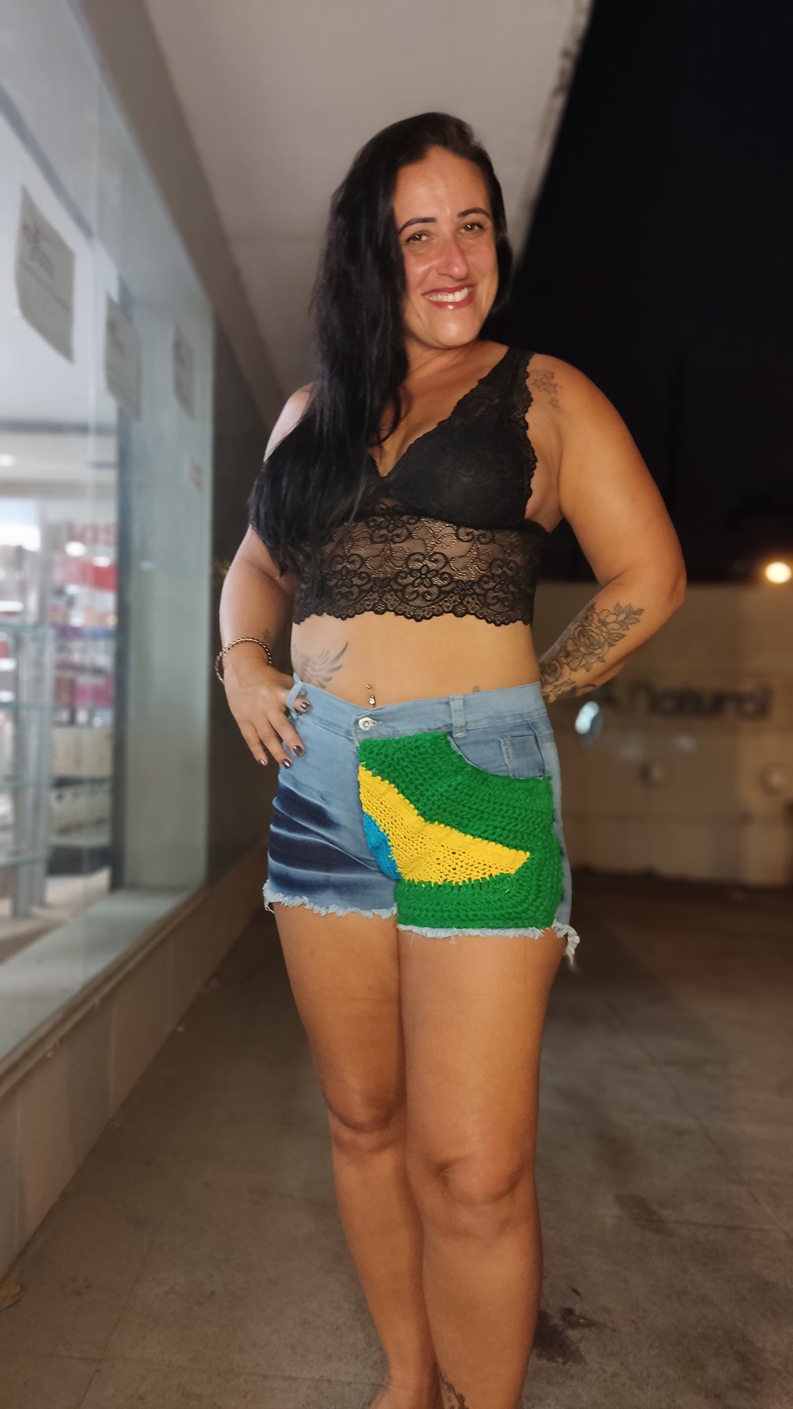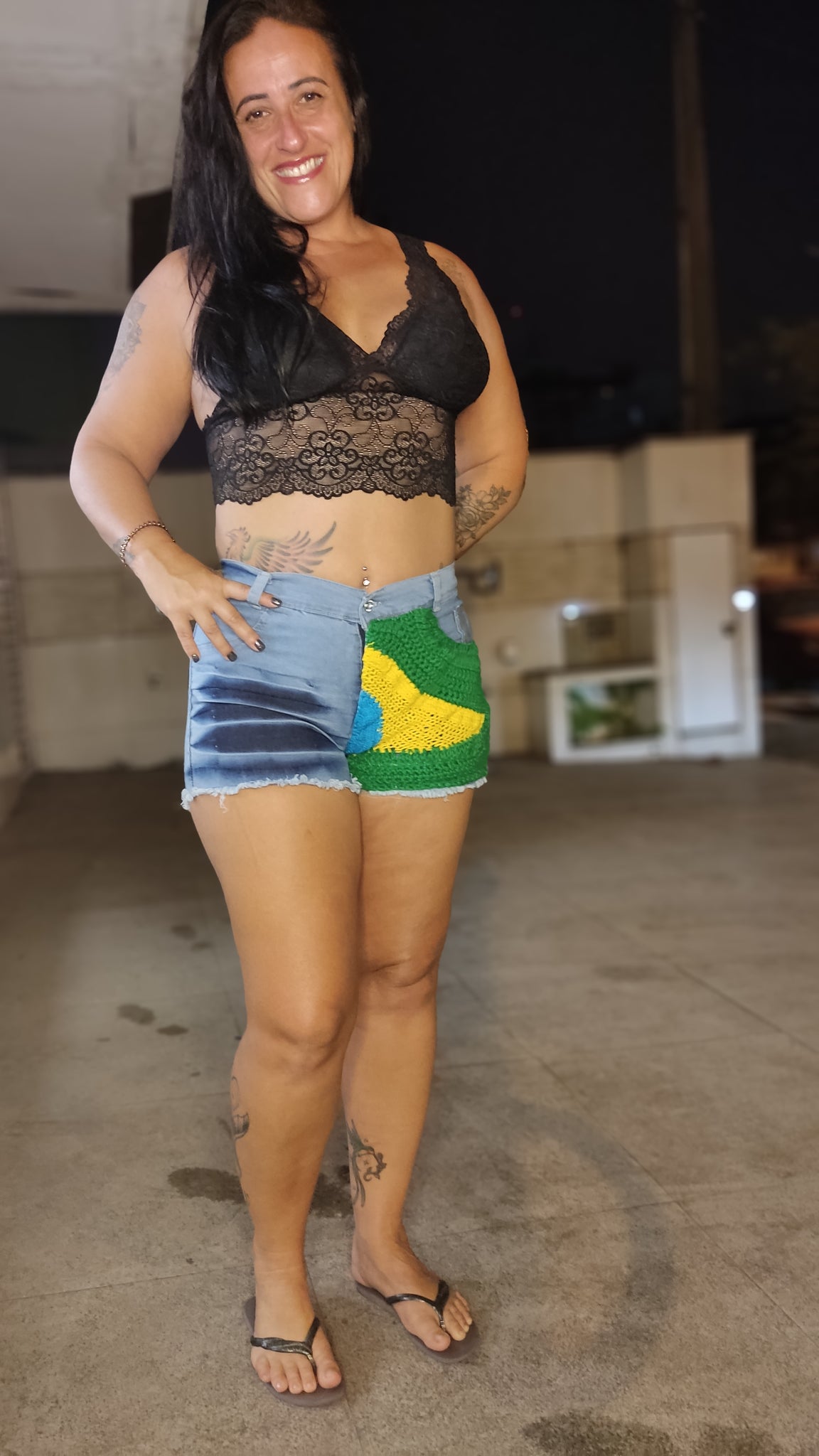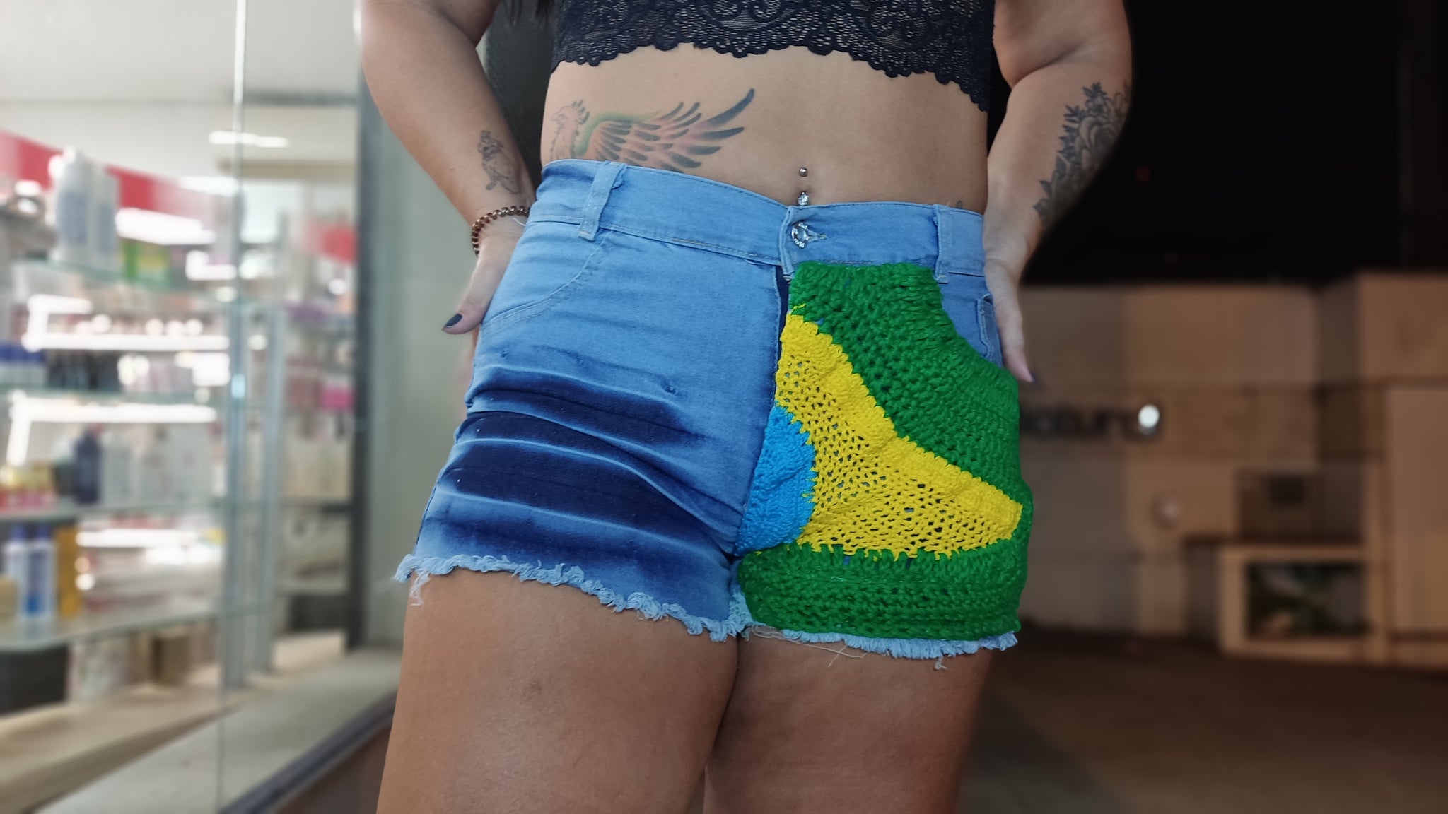 Shorts em jeans com elastano customizado em tricô , cóz alto , modelo exclusivo pode haver variações na lavagem do Jeans.