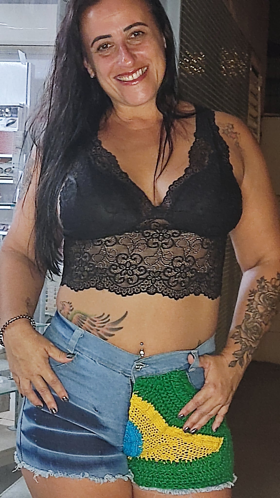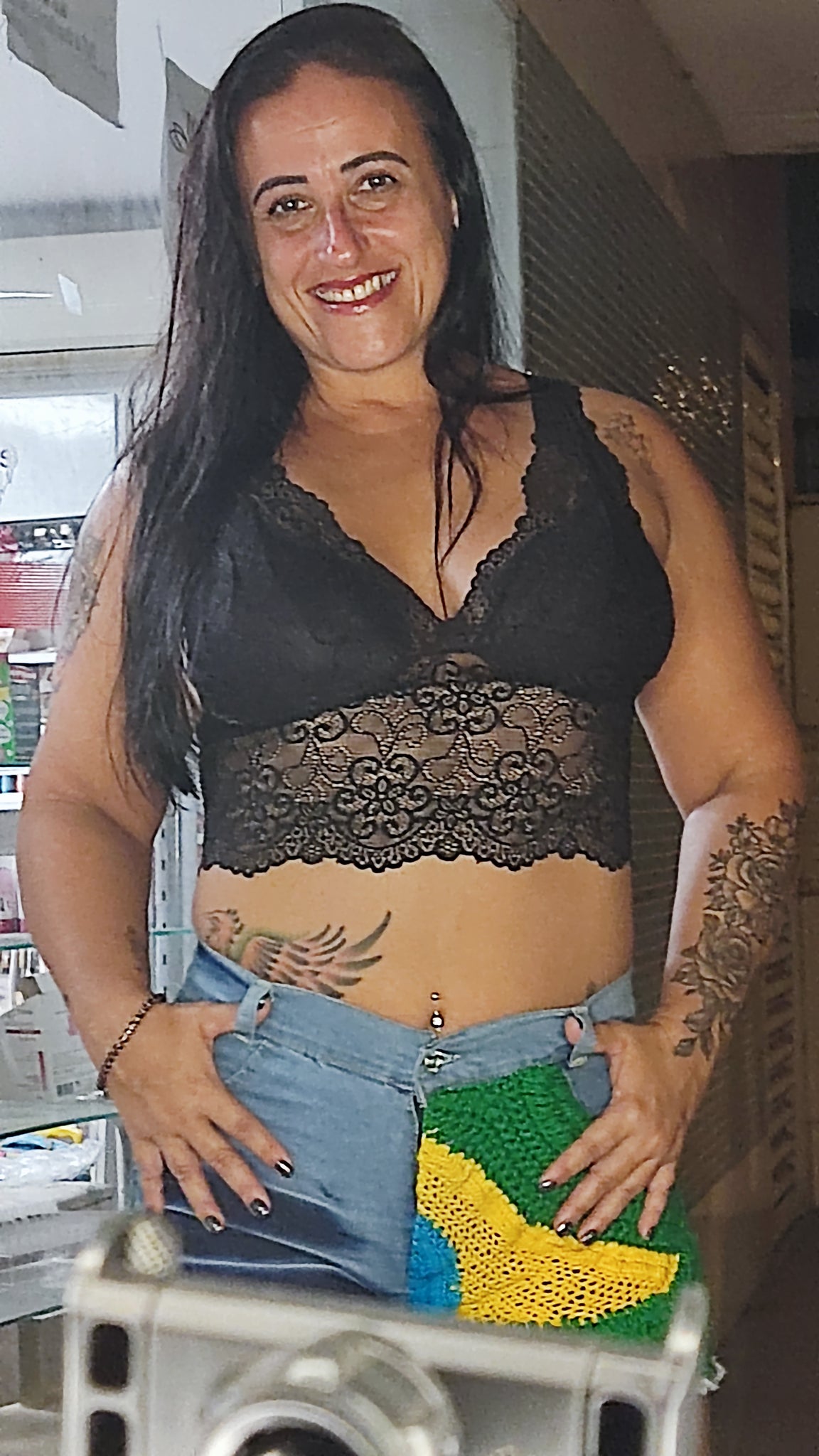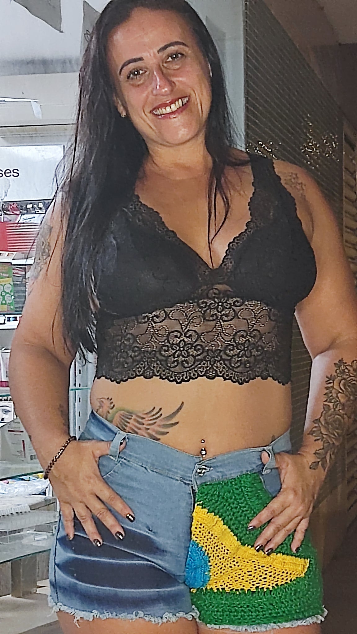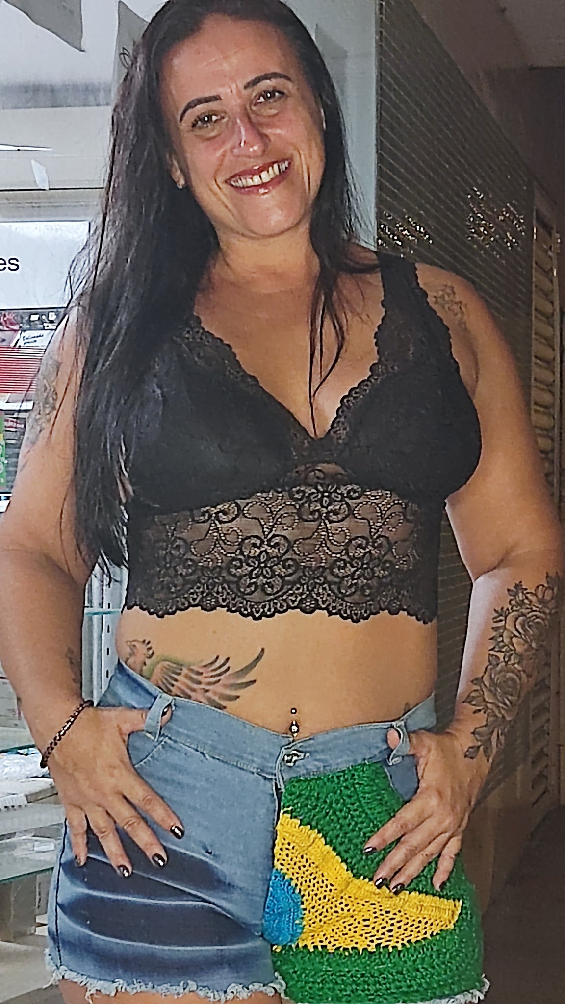Shorts em jeans com elastano customizado em tricô , cóz alto , modelo exclusivo pode haver variações na lavagem do Jeans.
