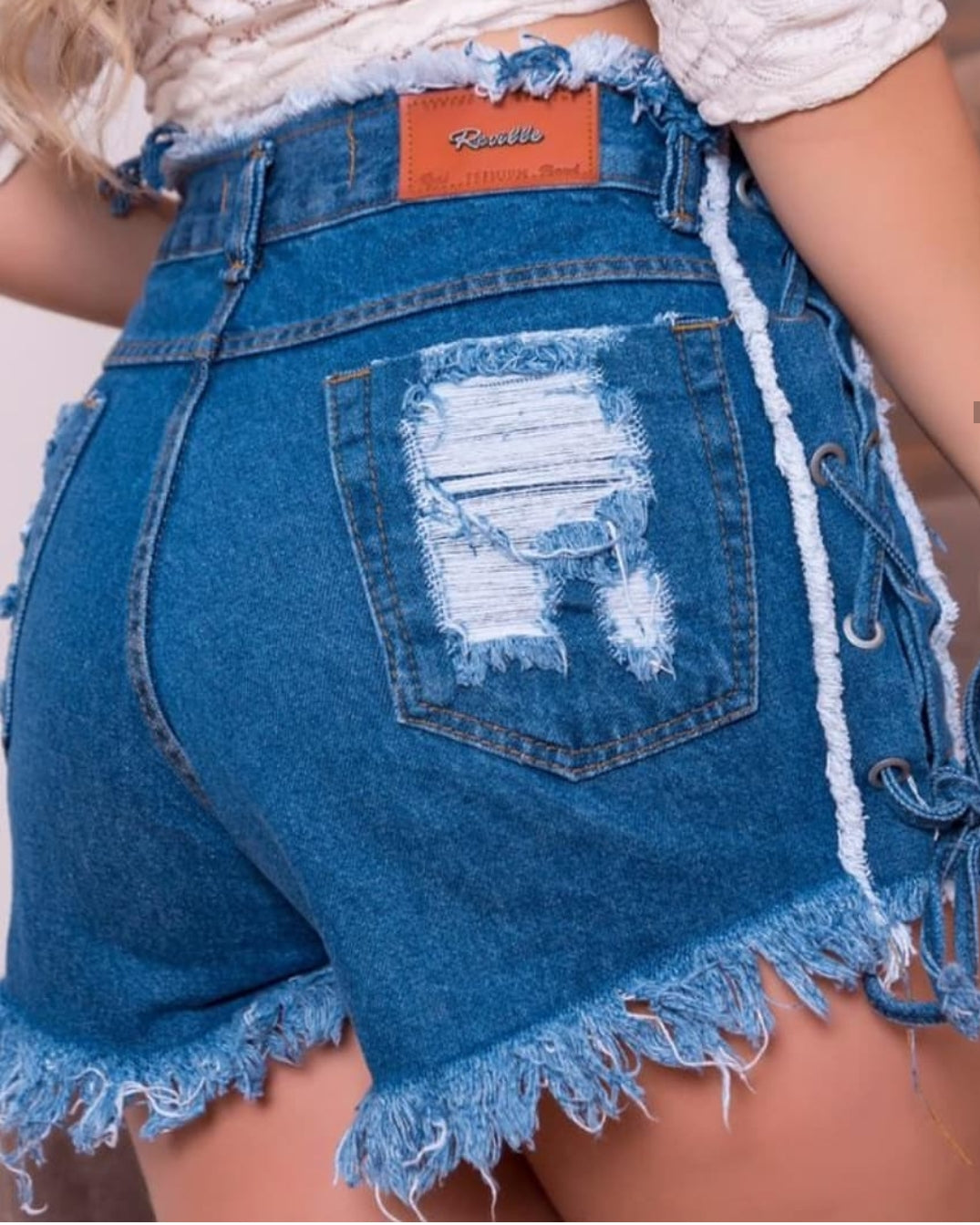 Shorts jeans descolado com detalhes laterias de cadarço customizado, com bolsos traseiros e zíper frontal.