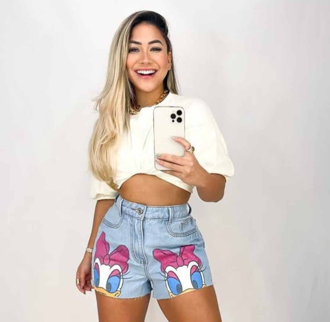Shorts jeans 100% algodão sem elastano com bolsos laterias e traseiro, na lavagem clara e com customização pintada da personagem margarida na frontal.