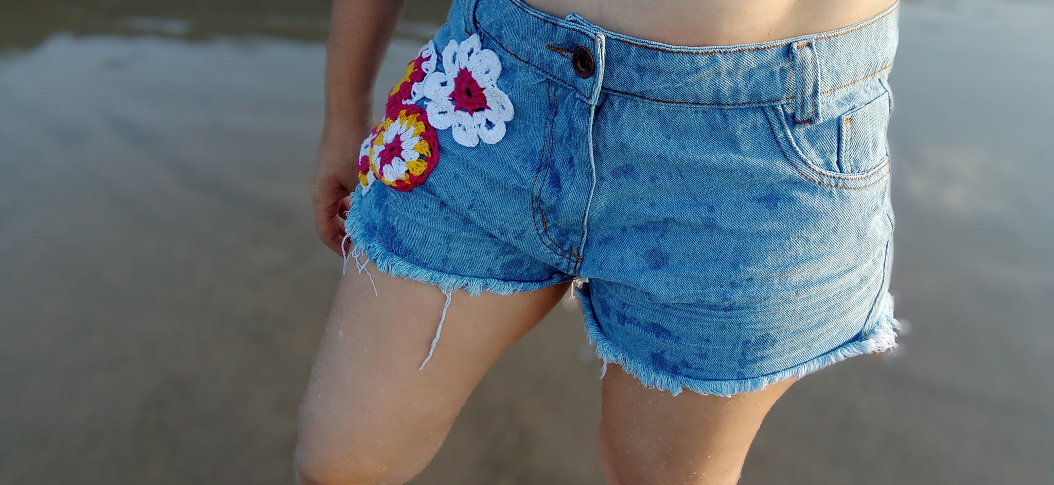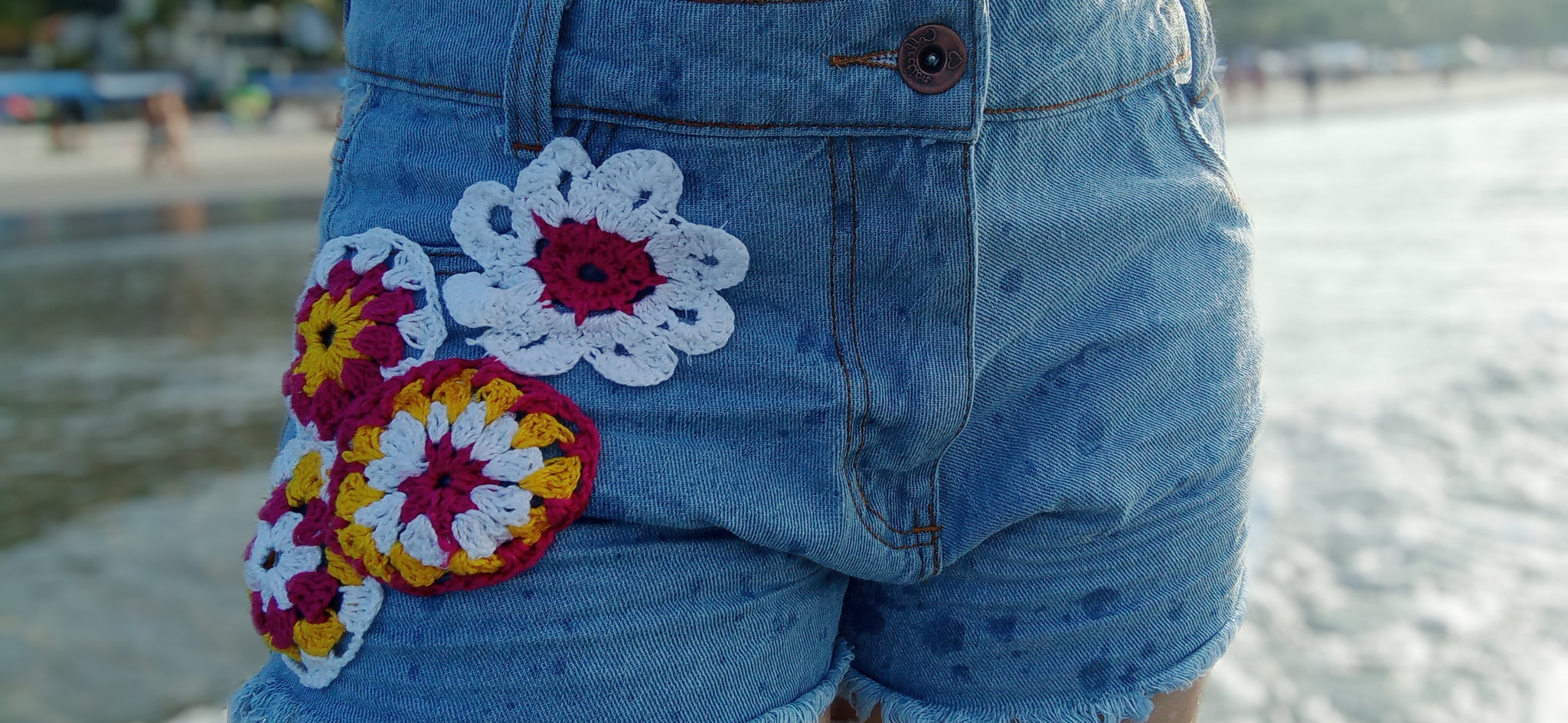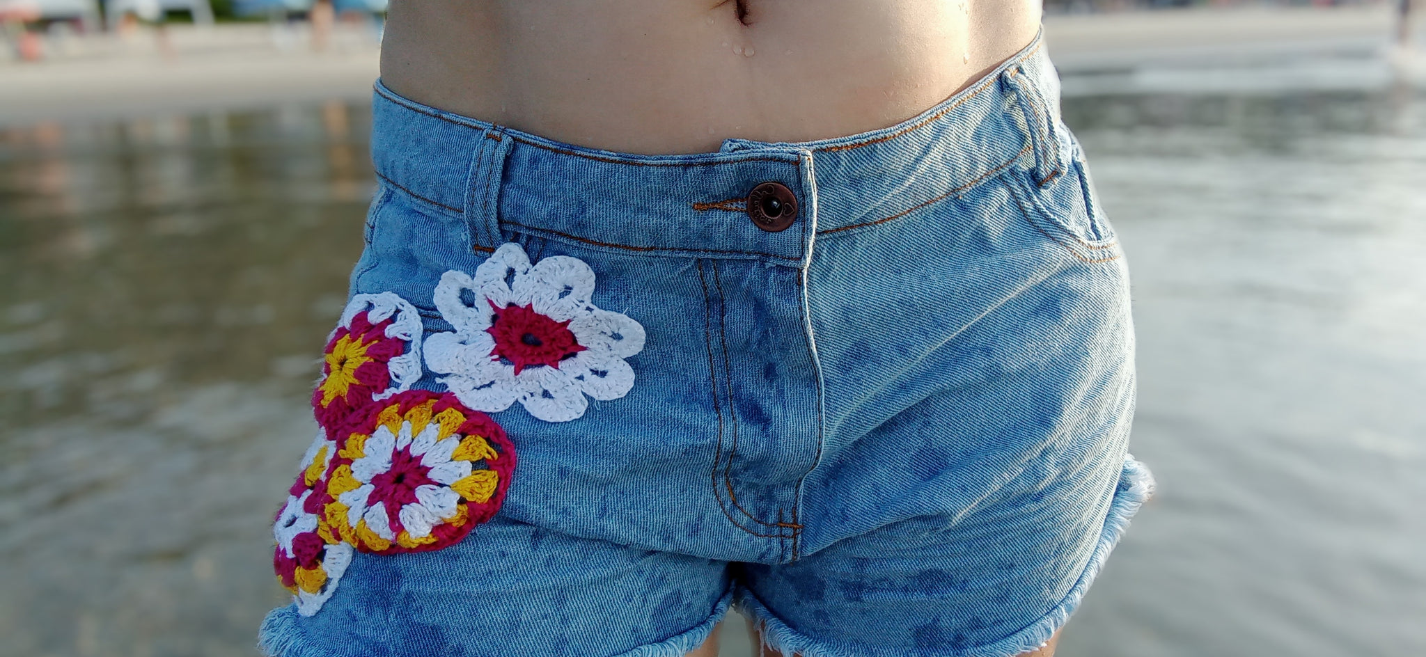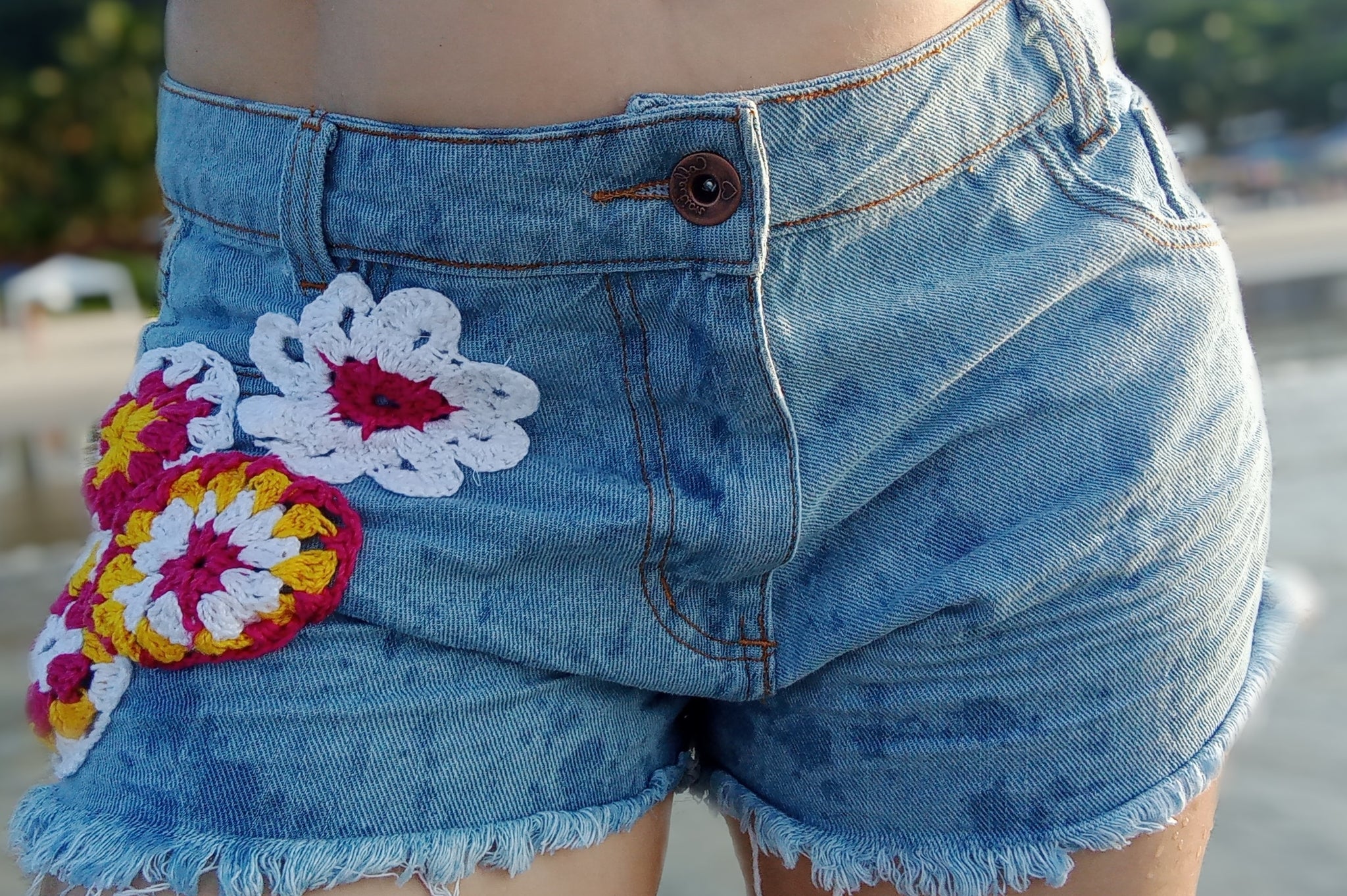 Shorts em jeans com detalhes laterais em mandala em flores de crochê costurado feito a mão , totalmente exclusivo . Crochê uma tendência que é utilizada a anos , designer totalmente brasileiro
