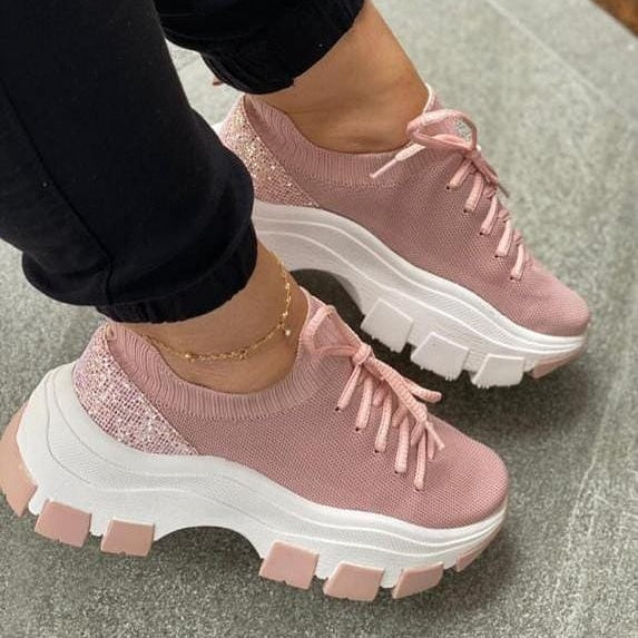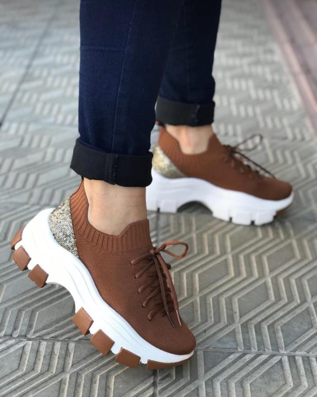 Tênis no modelo meia com solado emborrachado anti-derrapante com gomas em detalhes na altura de 5 cm modelo tratorado , com detalhes em glitter traseiro e cadarço para amarração superior ( simples detalhe ) calçamento estofado , propicio para o dia a dia
