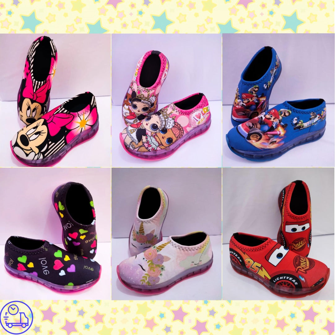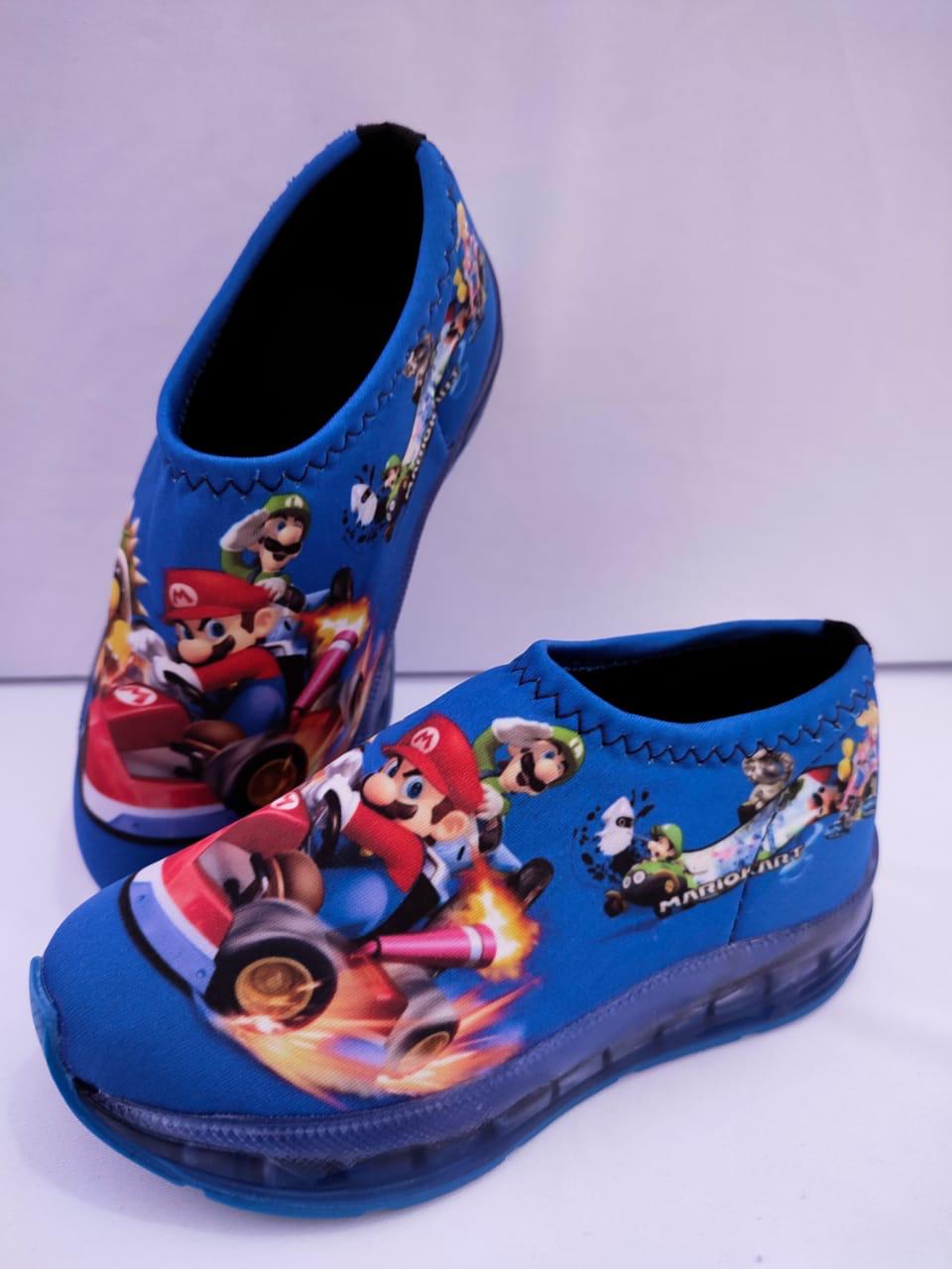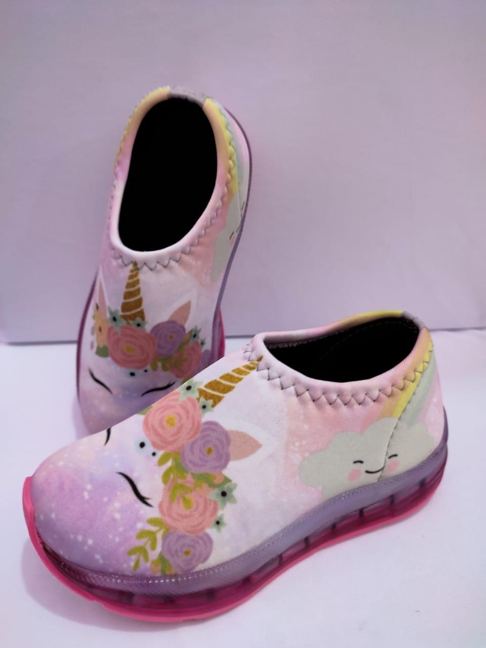 Tênis modelo meia confortável com personagens e estampas coloridas e vivas, solado vulcanizado macio e leve acompanha luz de led na sola  que acende ao pisar.