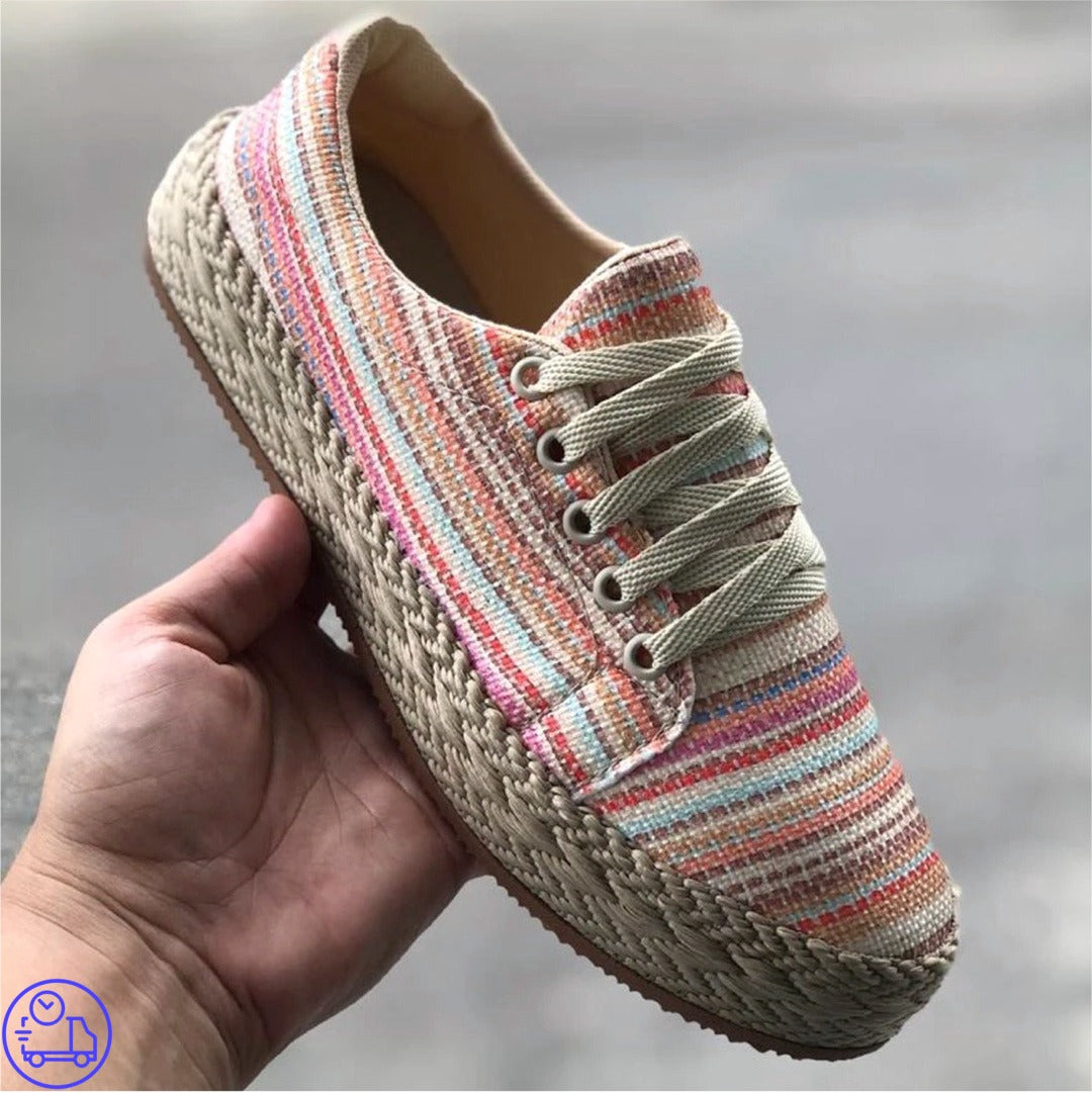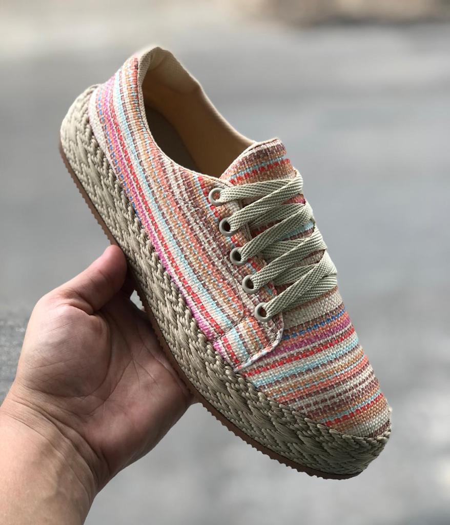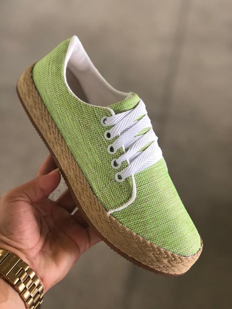 Tênis com solado em corda e parte superior em tecido forrado com cadarço para amarração, leve e confortável.