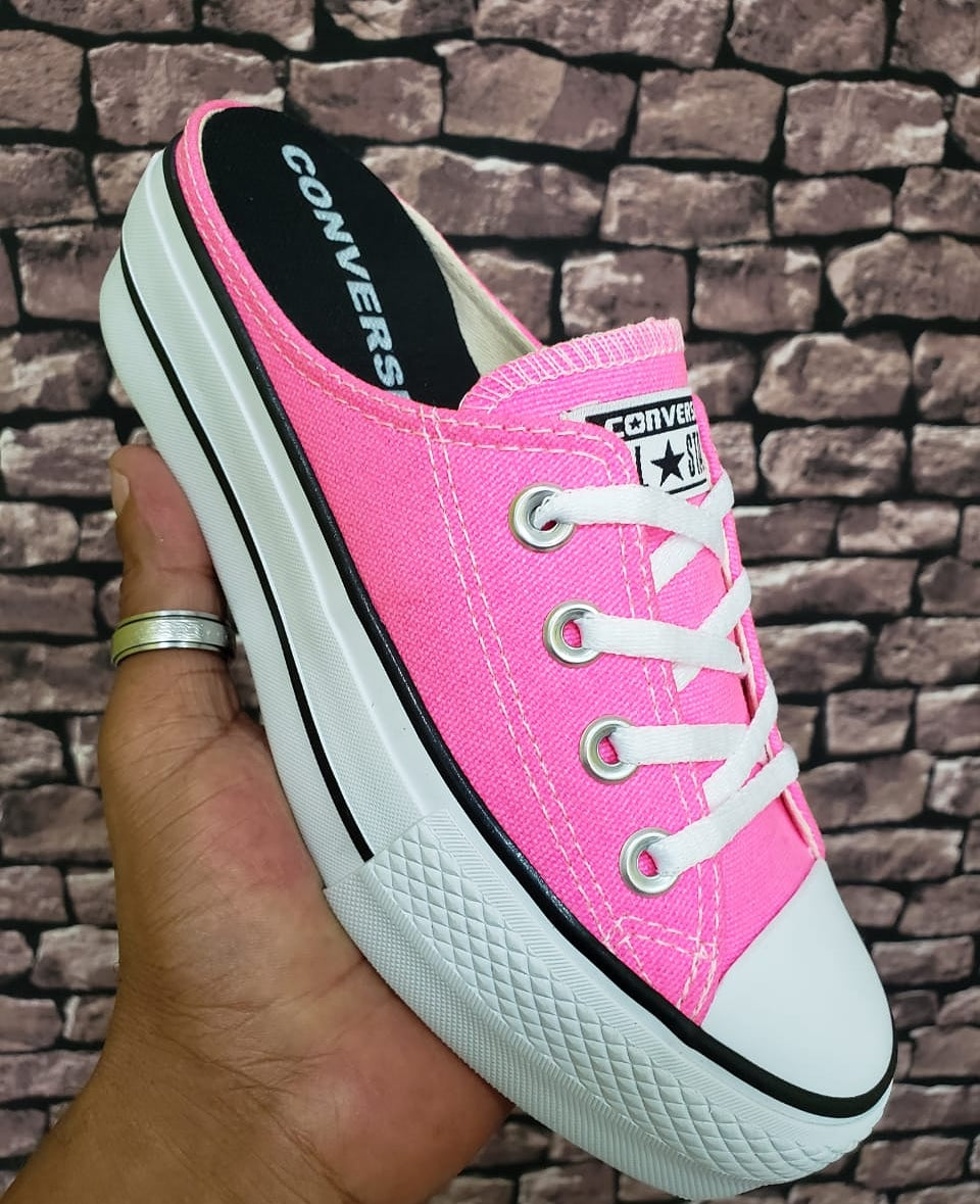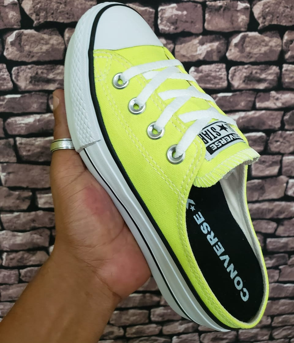 Tênis no modelo mulle com solado vulcanizado alto flatform com 6cm, palmilha macia , parte superior em lona super resistente e confortável com cores vibrantes e neon fala grande do 34 ao 39.