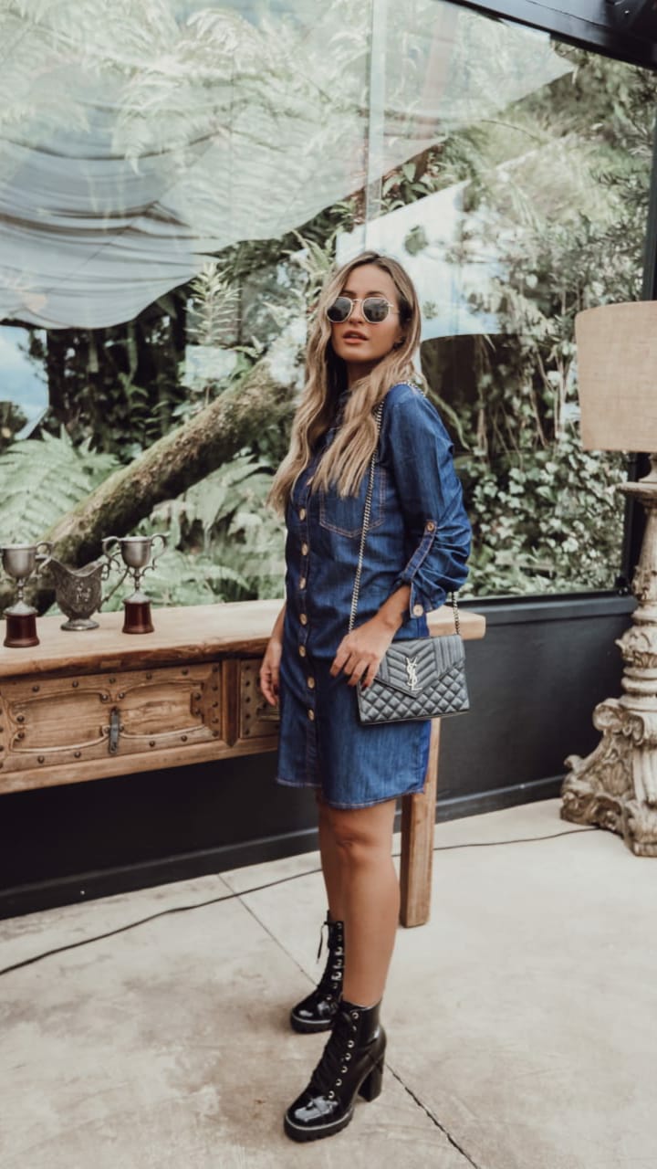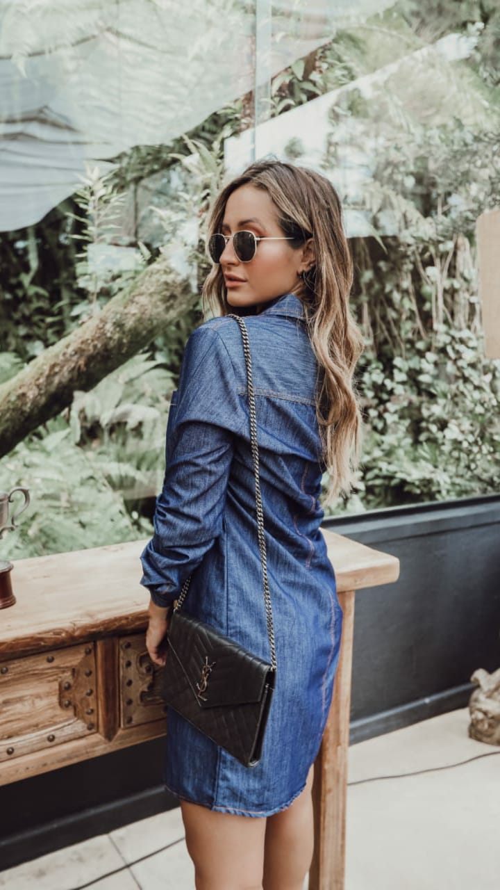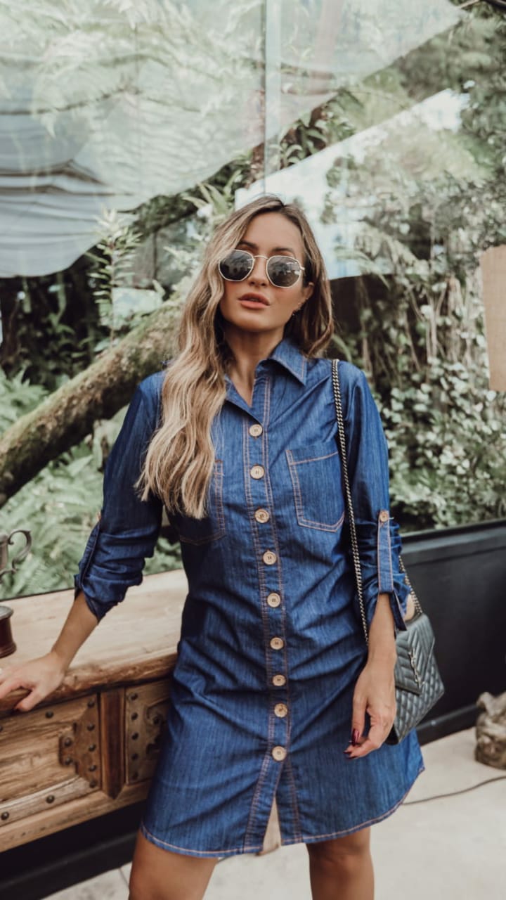 Vestido Chemise manga longa jeans leve com caimento elegante e moderno.