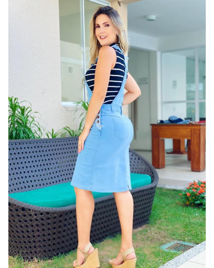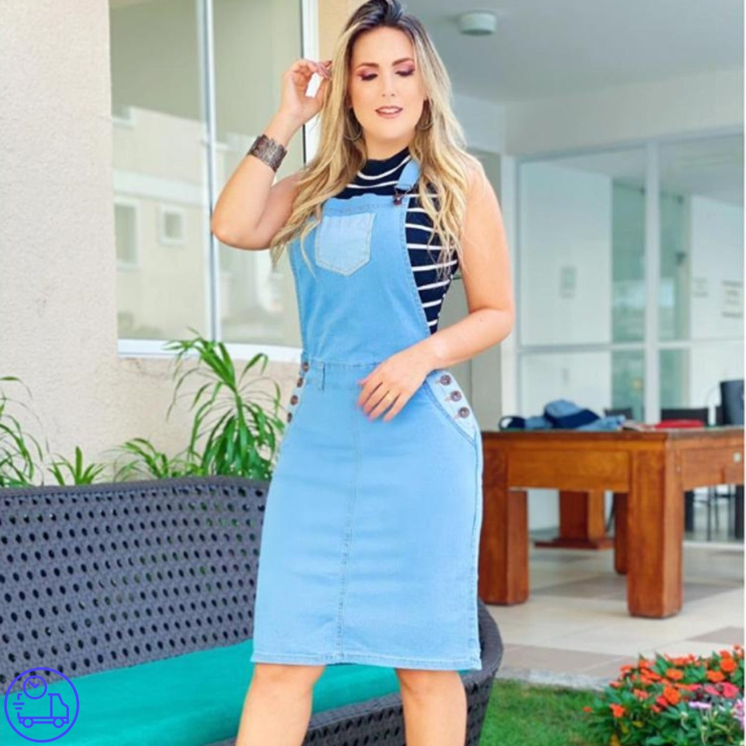 Salopete jeans moda despojada e linda.  Jeans com Lycra em tonalidade clara e detalhe em bolso frontal. O tecido elástico permite um caimento leve e agradável.