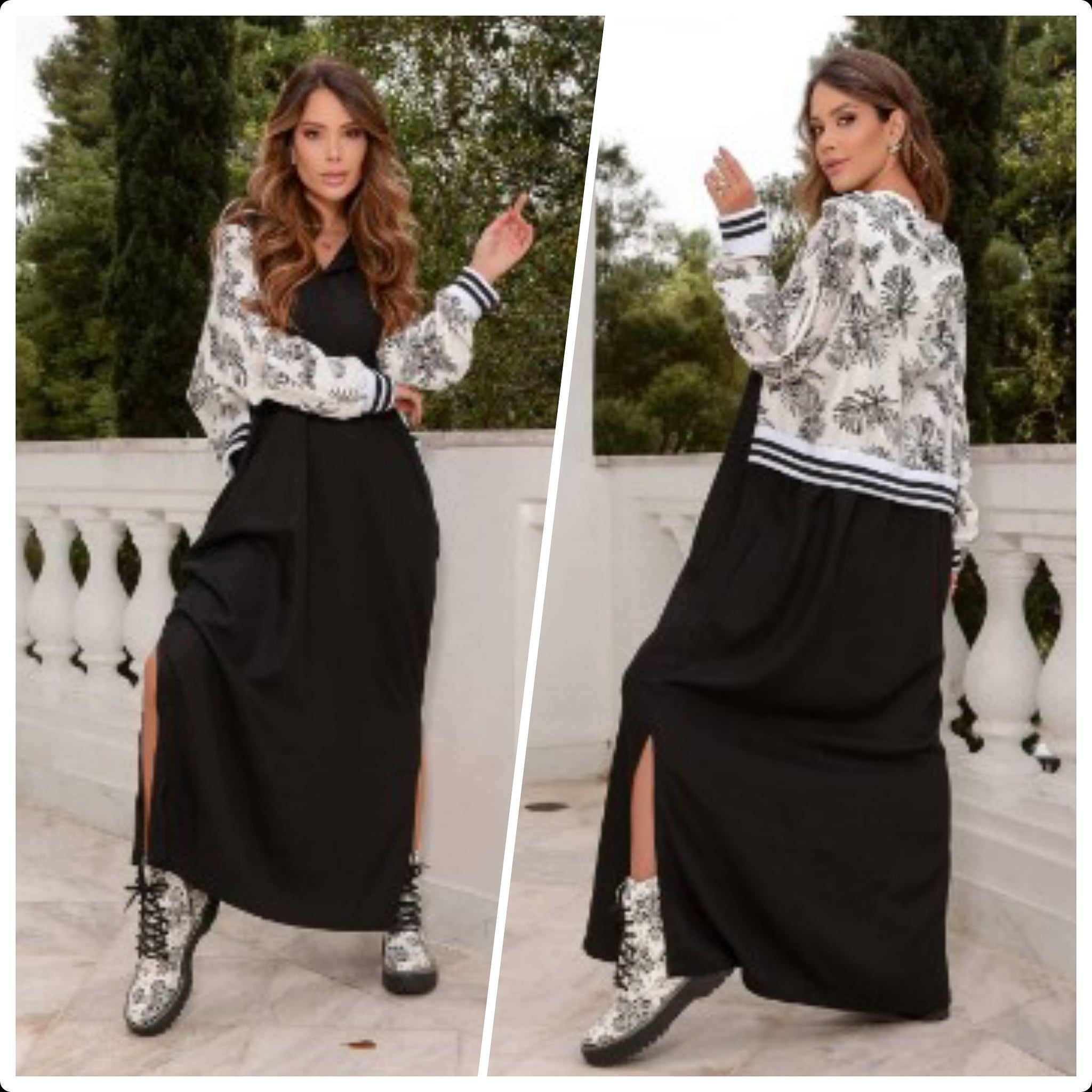Vestido. Longo Viscose e sarja com mangas estampadas , punhos e capuz que dá a sensação de jaqueta . Lindo e diferente duas peças em uma só. Veste do 38 ao 46