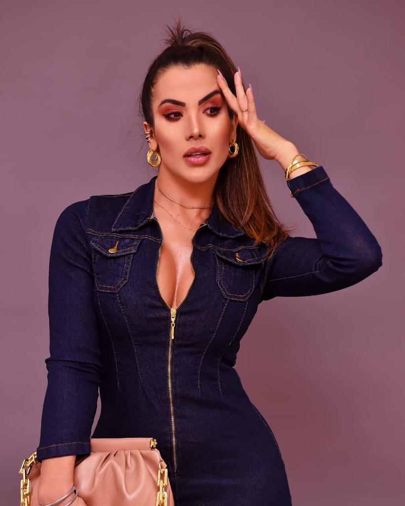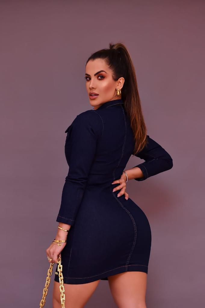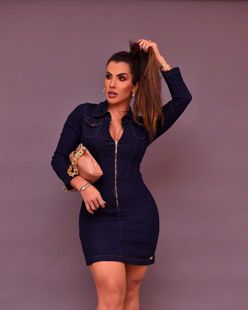 Vestido jeans com bastante elastano , manga longa com bolsos falsos frontais e zíper de abertura frontal , modela e define o corpo