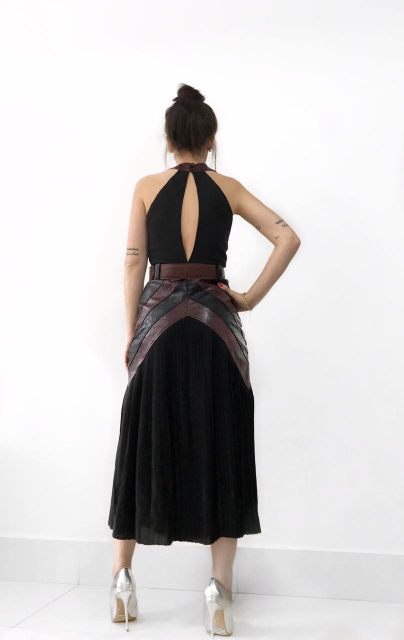 Vestido midi forrado todo em crepe Georgete e couro de duas cores. Com acabamento externo e interno de excelente qualidade e caimento leve , simplesmente lindo. Ziper traseiro (não acompanha cinto)