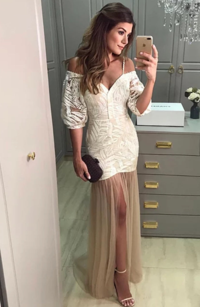 Vestido todo de guipir branco com fios dourados, manga bufante e calda de tule para finalizar a perfeição.