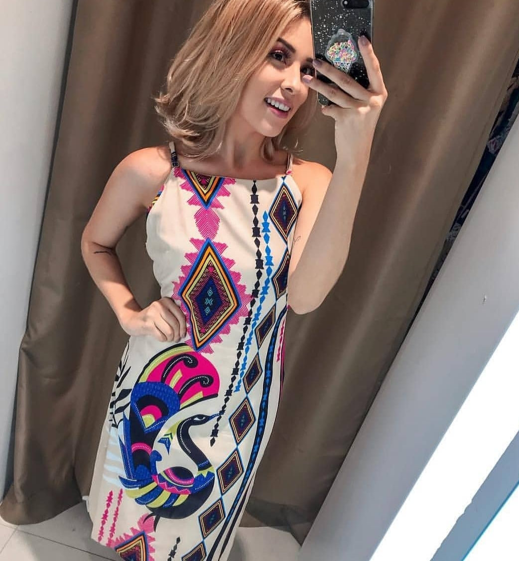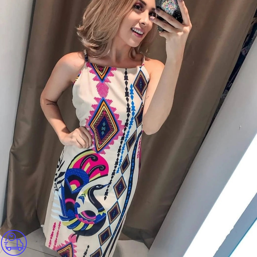Tecido viscose, zíper traseiro e regulagem na alça.