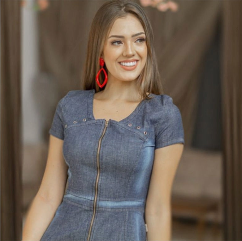 Vestido com manga e decote princesa com lavagem diferente em duas tonalidades de azul, com um ziper frontal. Super leve e confortável. Verdadeiramente lindo.