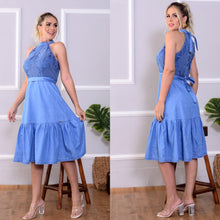 Vestido em jeans leve em elastano regata com parte superior em jeans forrado com renda trabalhada no jeans. Super delicado e elegante. Caimento perfeito, um verdadeiro luxo. Disponível nas cores clara e escura do 38 ao 42.