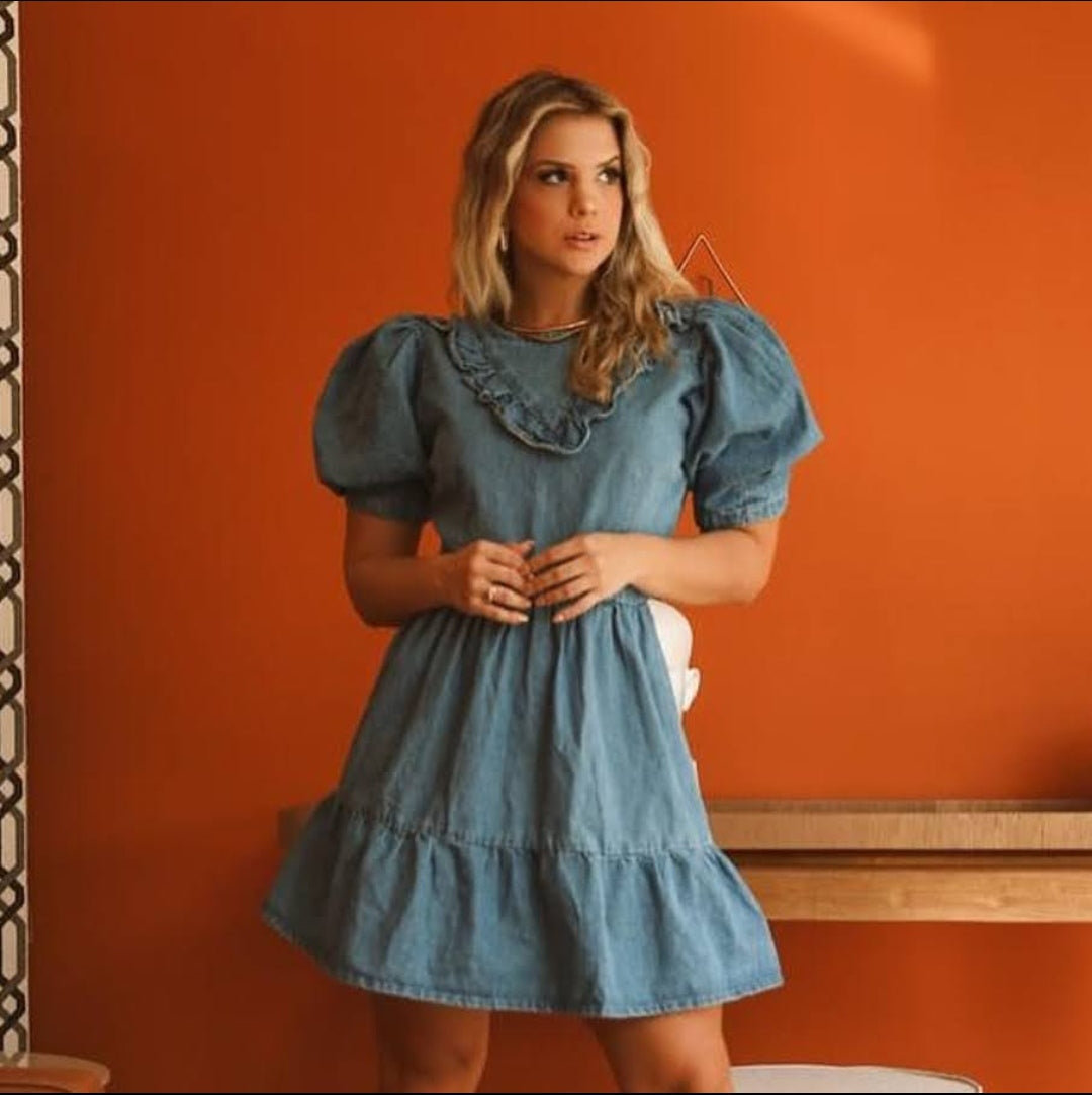 Vestido em jeans leve sem elastano com leve lavagem , manga balonê babado leve na barra e detalhe frontal . Zíper de abertura traseira . Pura Elegância.