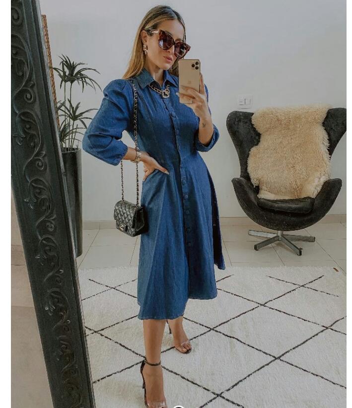 Vestido jeans leve, sem elastano, com botões frontais e magas 3/4 levemente bufante.