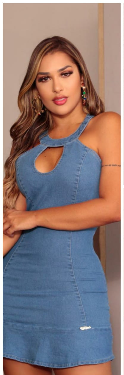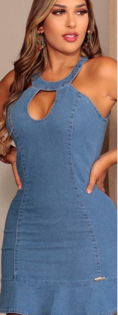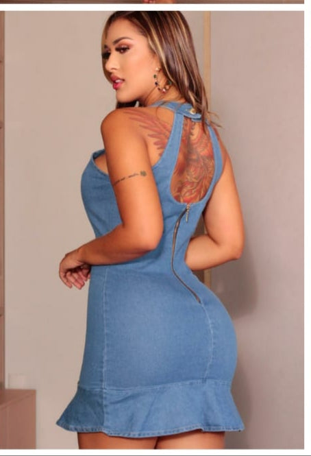 Vestido em jeans com elastano, detalhes traseiro em tiras e um leve babado na barra