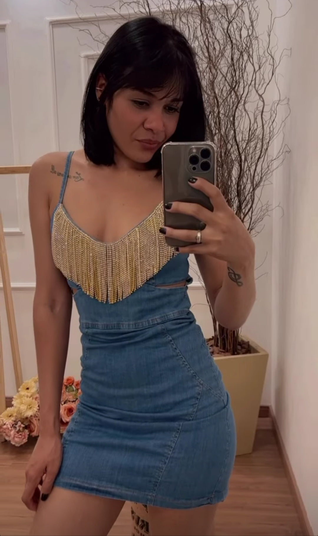 Vestido em jeans com elastano modelo tubinho com detalhe em abertura lateral e correntes em strass frontal. Tecido de excelente qualidade .