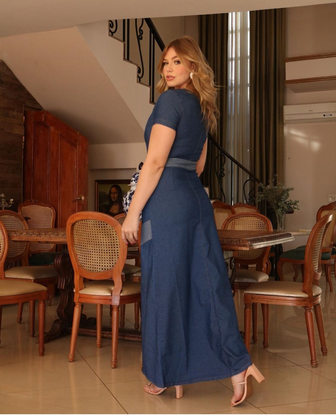 Vestido longo com composições de cores no jeans claro e no jeans escuro , tecido tencell caimento leve sem elastano com ziper de abertura e fenda frontal . Disponível do 36 ao 44.
