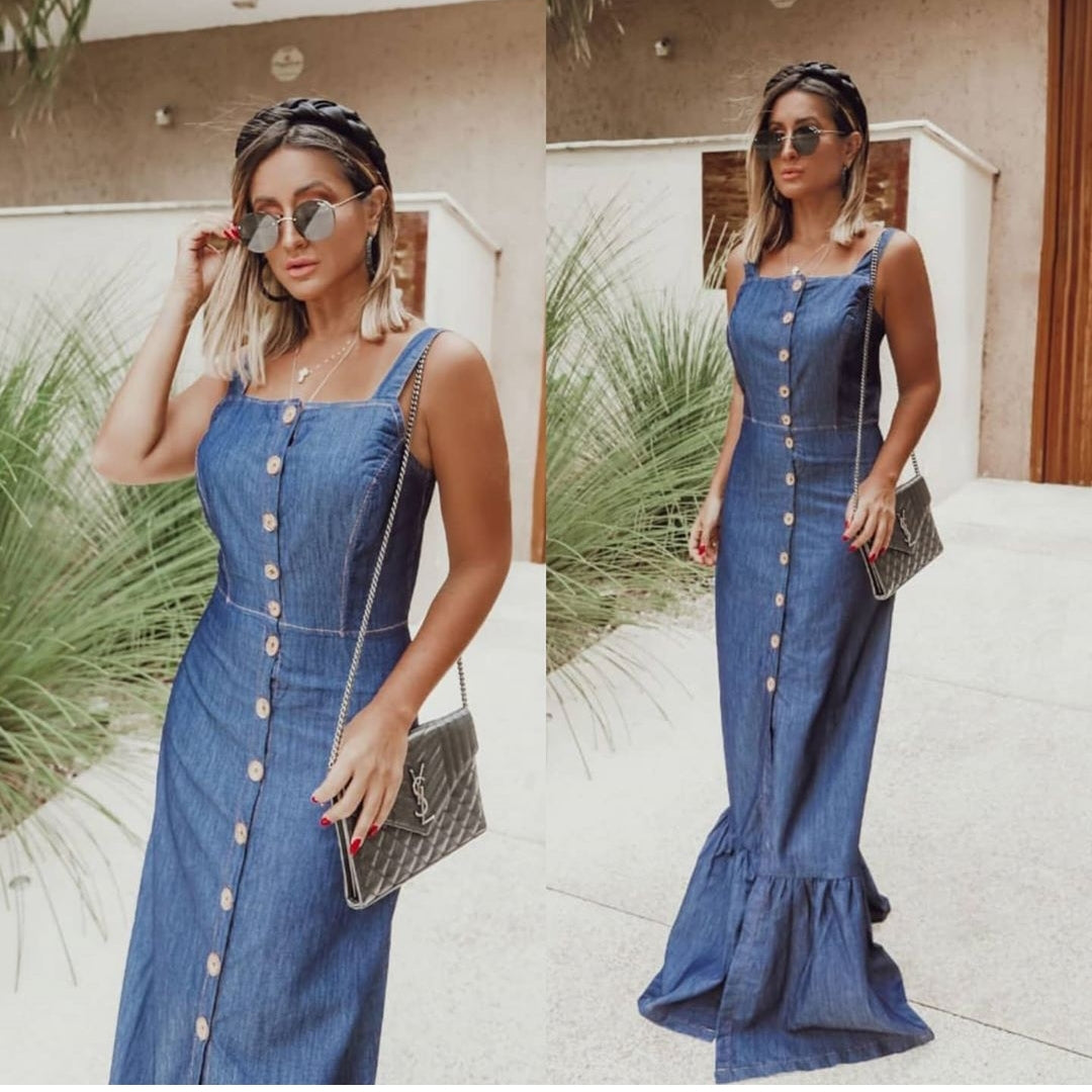 Vestido jeans longo com botões frontais e alça. Jeans leve sem elastano.