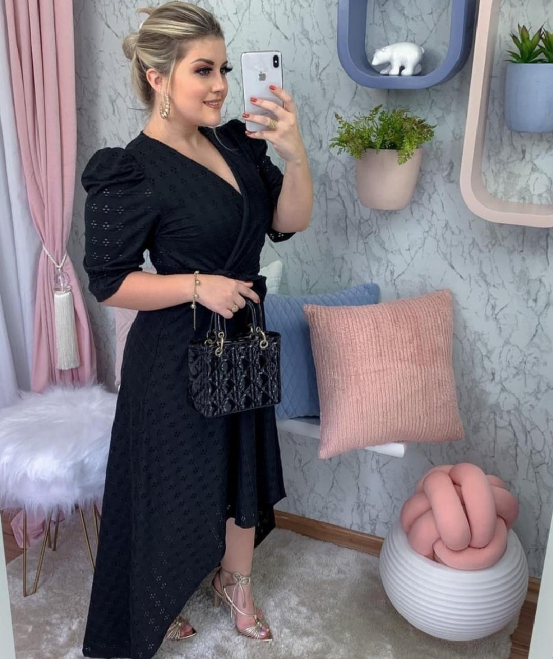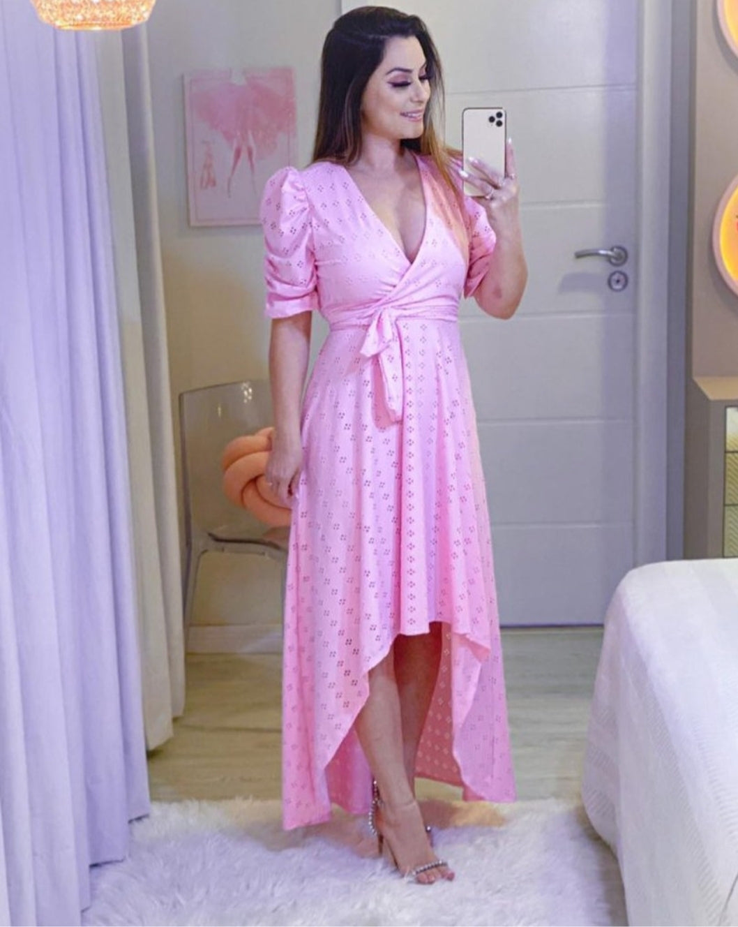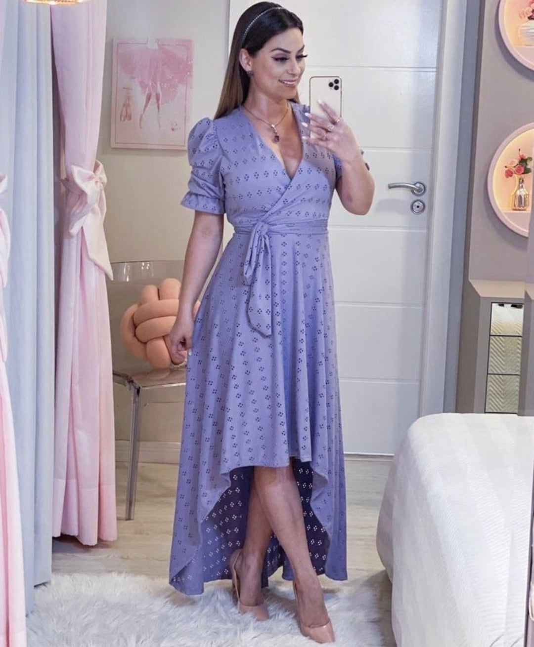 Vestido no modelo mullet gola em v com amarração na cintura e manga princesa , tecido malha lese que permite elasticidade maior a peça, caimento leve e confortável. Disponível nas cores lilás, preto, rosa, verde, vermelho e nude. Tamanho único 36 ao 46
