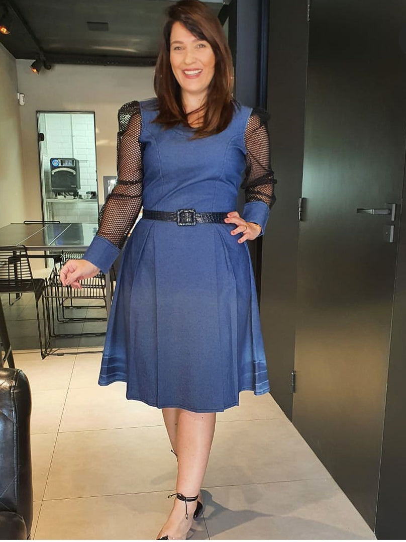 Vestido em jeans leve sem elastano com manga levemente bufante em tule com punho em jeans no estilo godê um verdadeiro luxo, bem moderno e estiloso além de vestir muito bem.