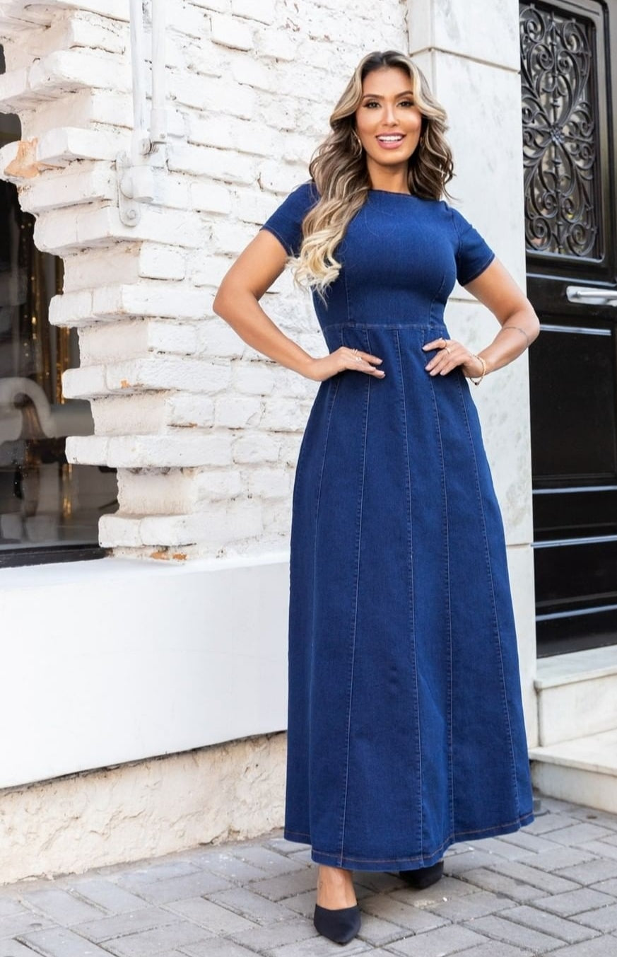 Vestido longo jeans com elastano manga curta , levemente cinturado  com leves detalhes frontal .corte tamanho normal , disponível do 36 ao 46