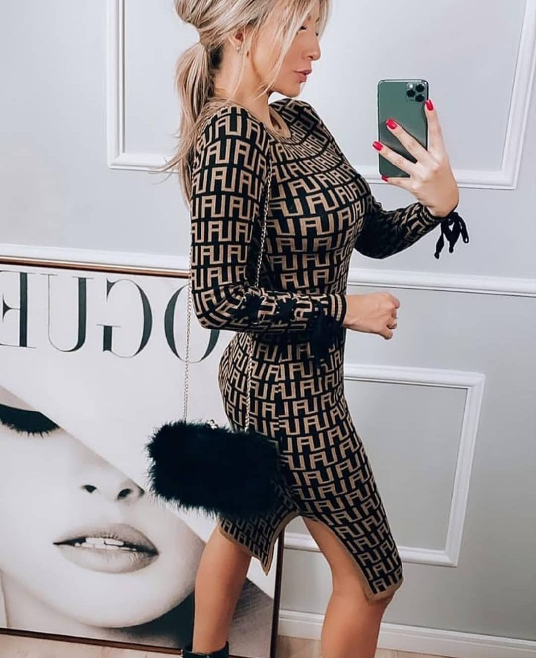 Vestido modal (tricô) manga longa no estilo tubinho comprimento midi com leve fenda lateral, com uma estampa diferenciada e moderna , inspiração total. Tecido que estica.