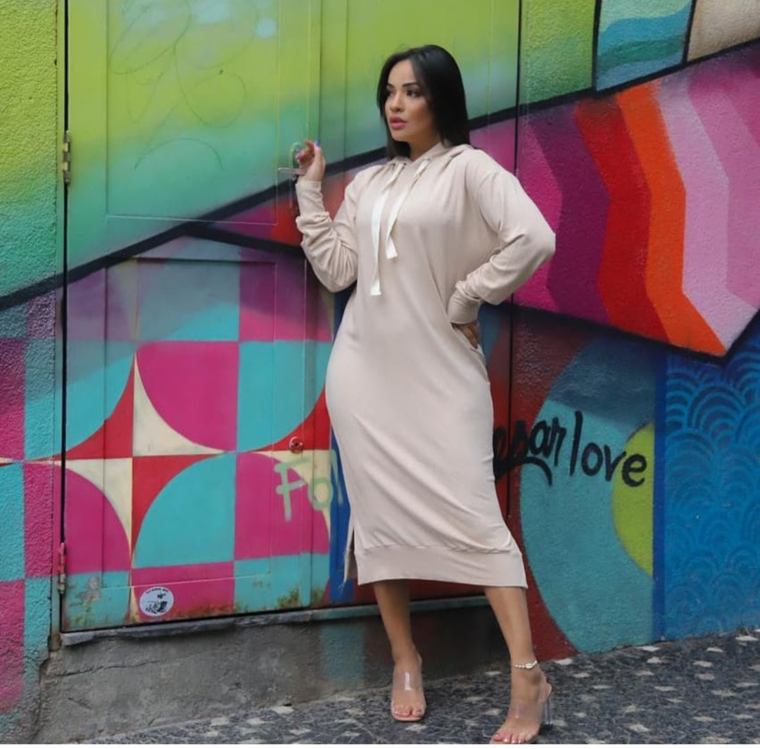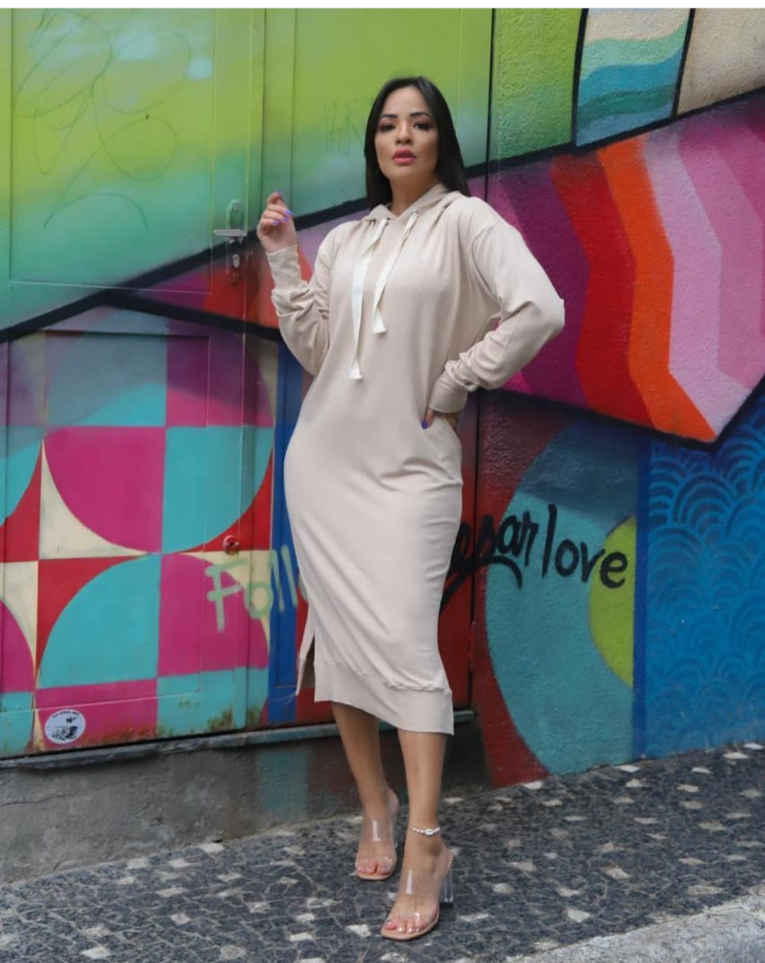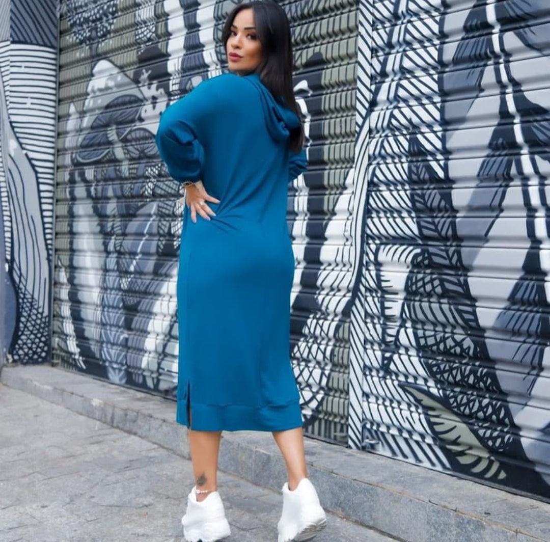 Vestido modelo camisão em moletinho com capuz e manga longa , confortavel e moderno além de bem despojado. Tamanho único veste do 40 ao 48