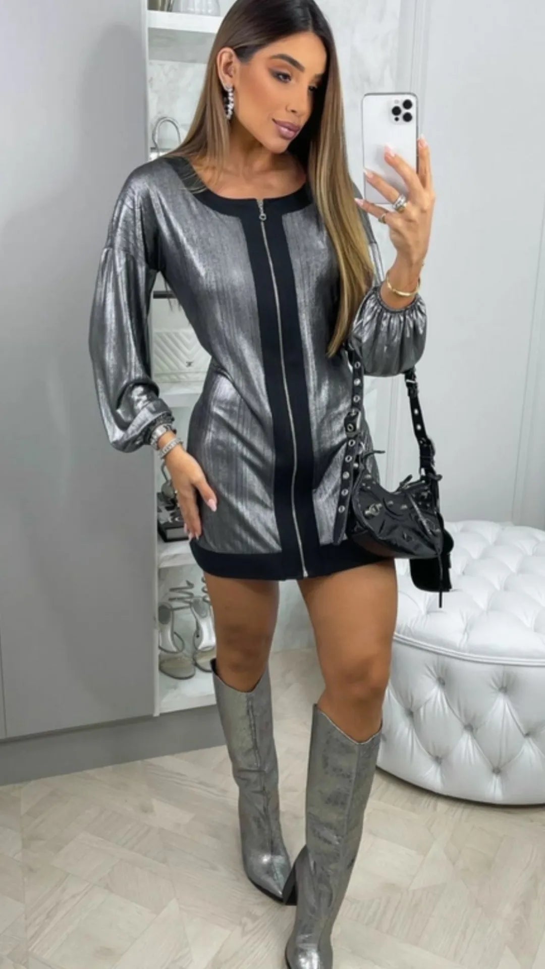 Vestido em lamê com pouca elasticidade, alto brilho ,modelo manga longa , com zíper frontal. Veste bem . Disponível do p ao g, veste p36/38,m40,g42/44