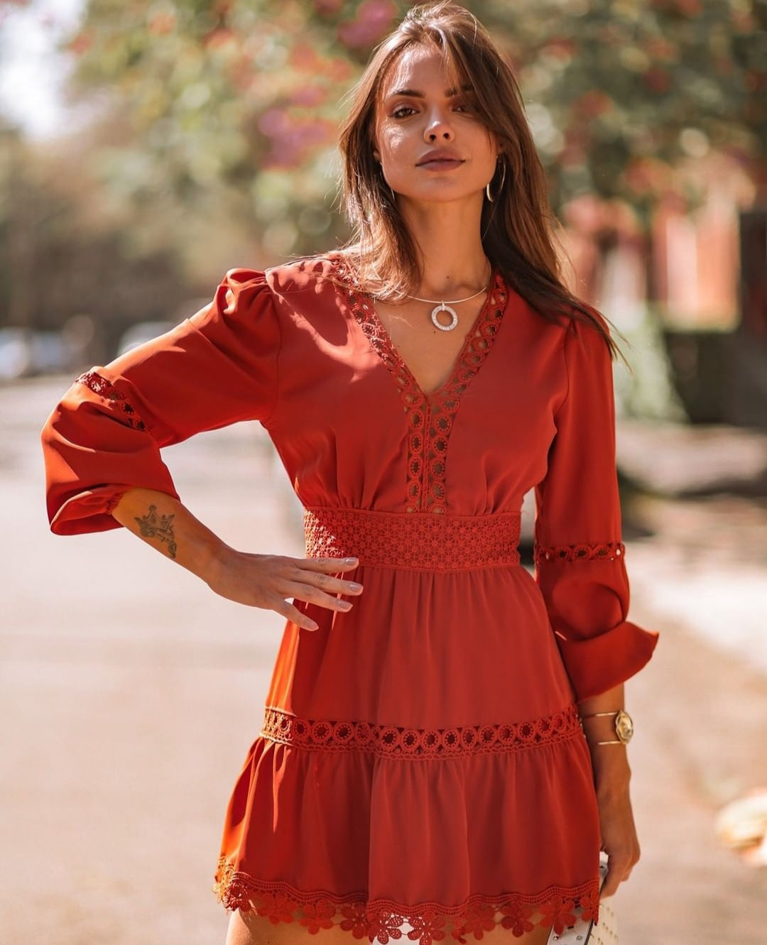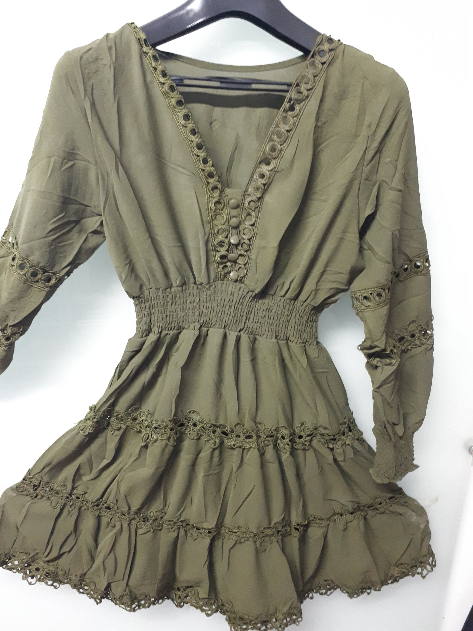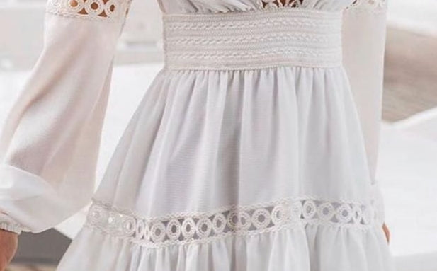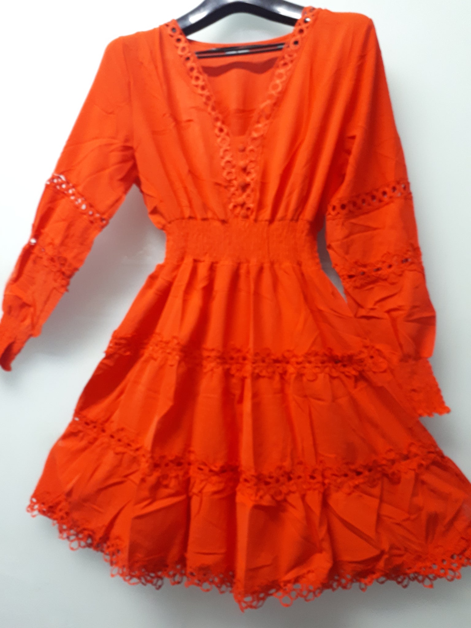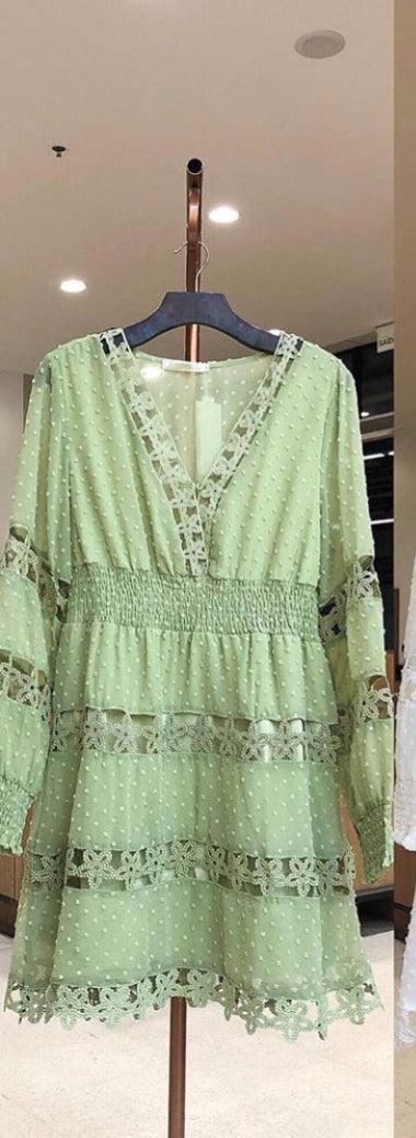 Vestido em algodão rendado soltinho e confortável tecido leve veste muito bem além de moderno com manga bufante rodada. decote em v com botoes decorativos e elástico na cintura.  Não transparente com um forro interno.