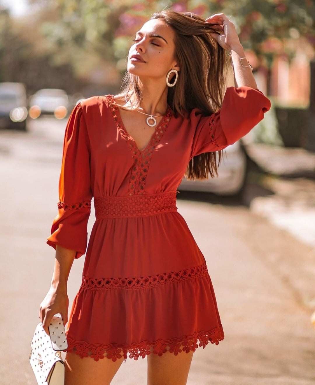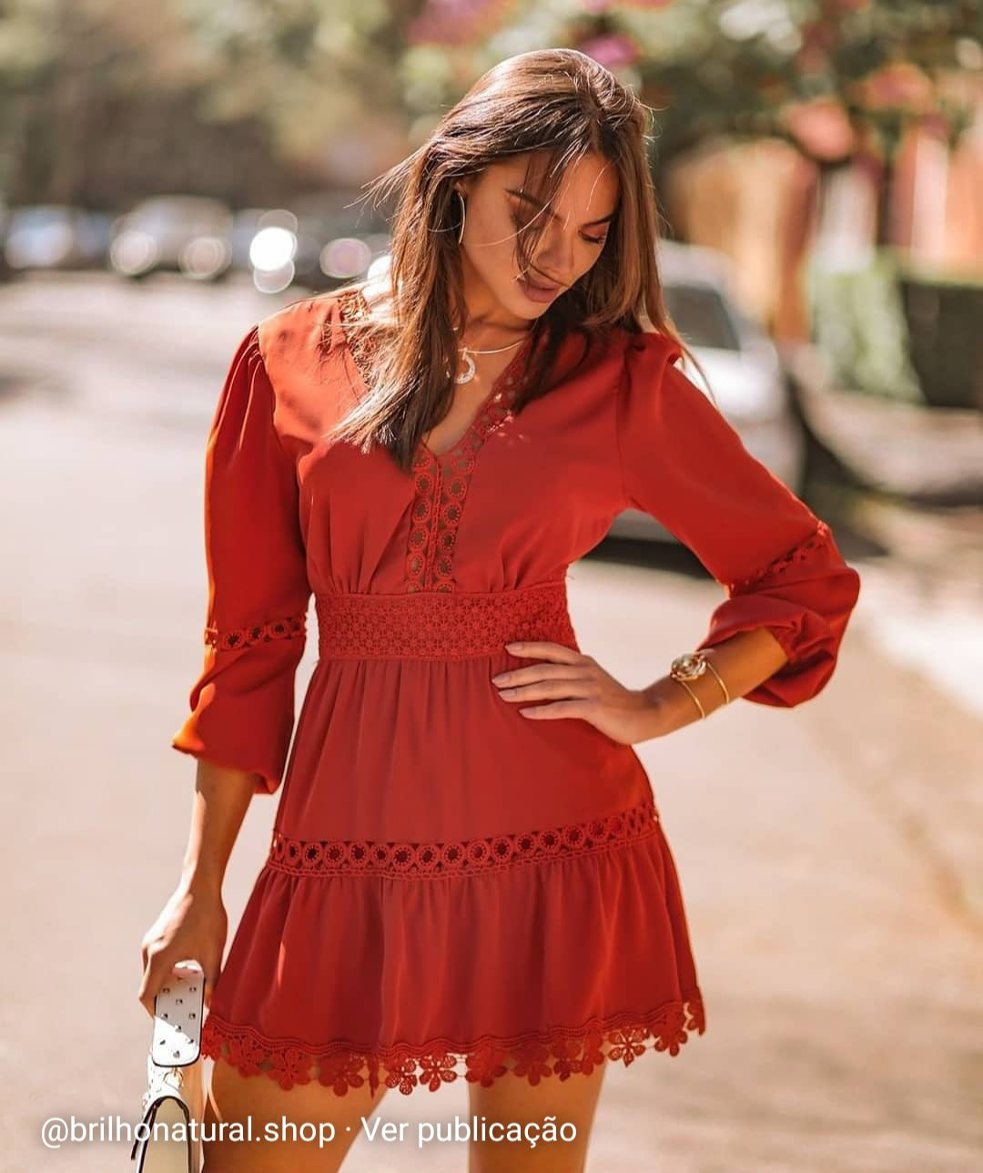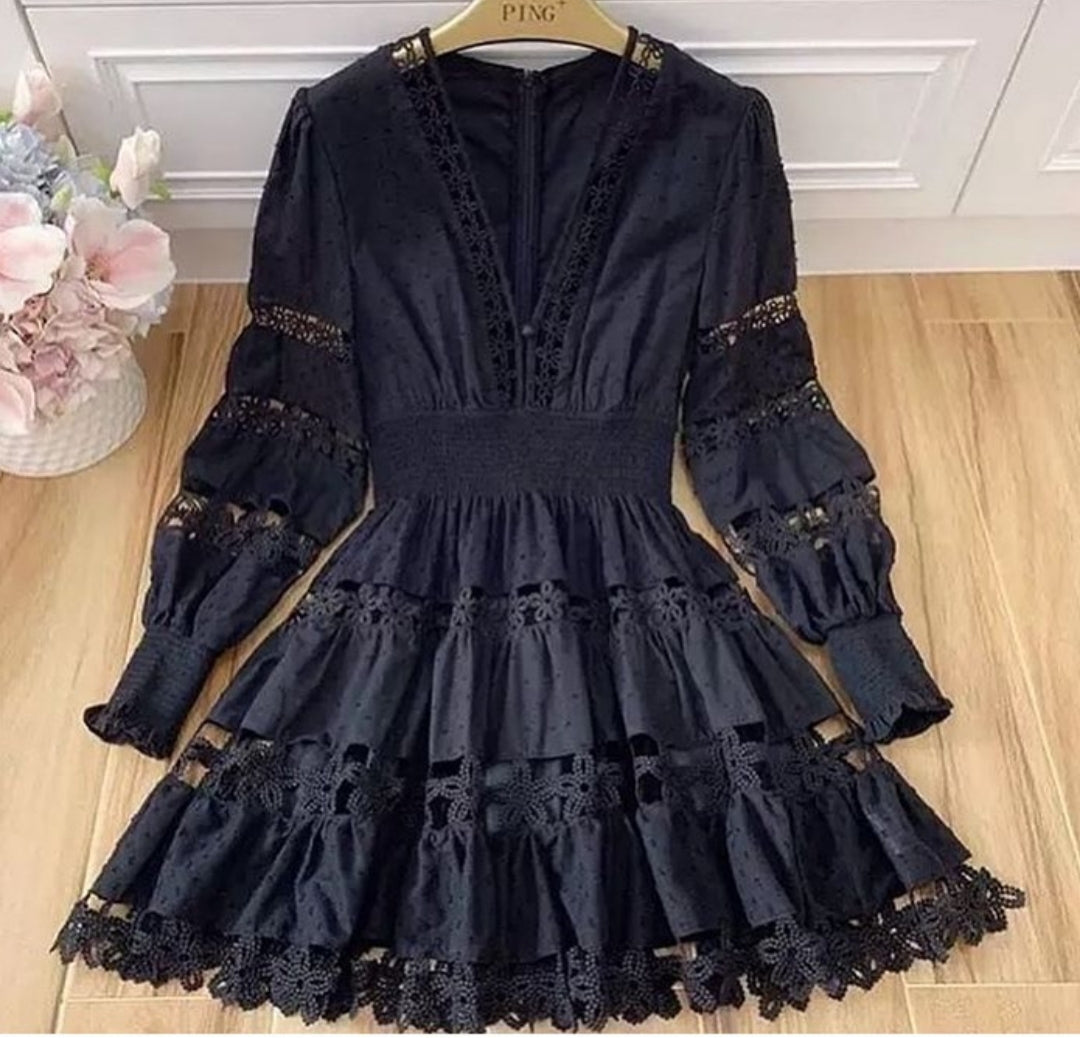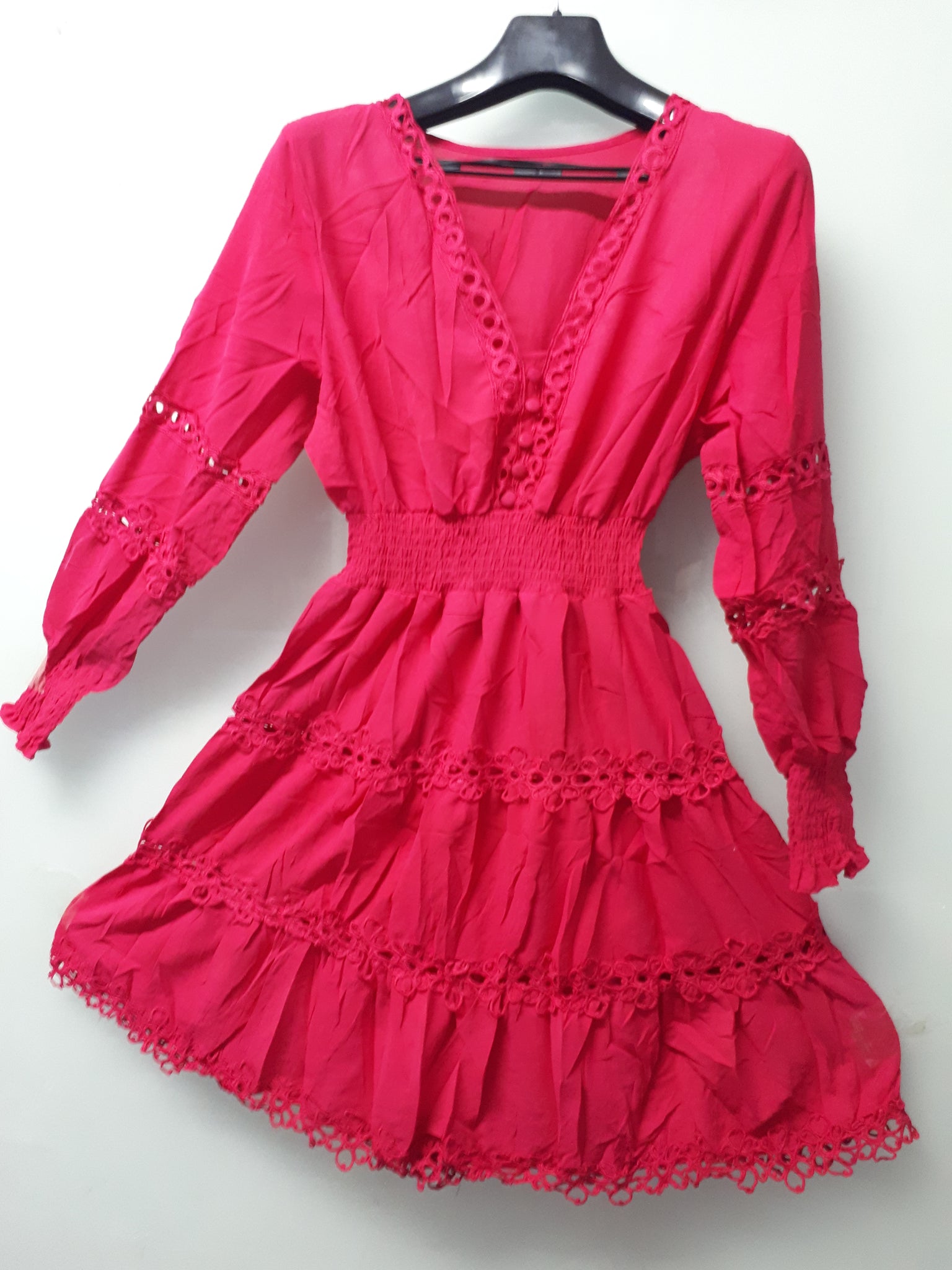 Vestido em algodão rendado soltinho e confortável tecido leve veste muito bem além de moderno com manga bufante rodada. decote em v com botoes decorativos e elástico na cintura.  Não transparente com um forro interno.