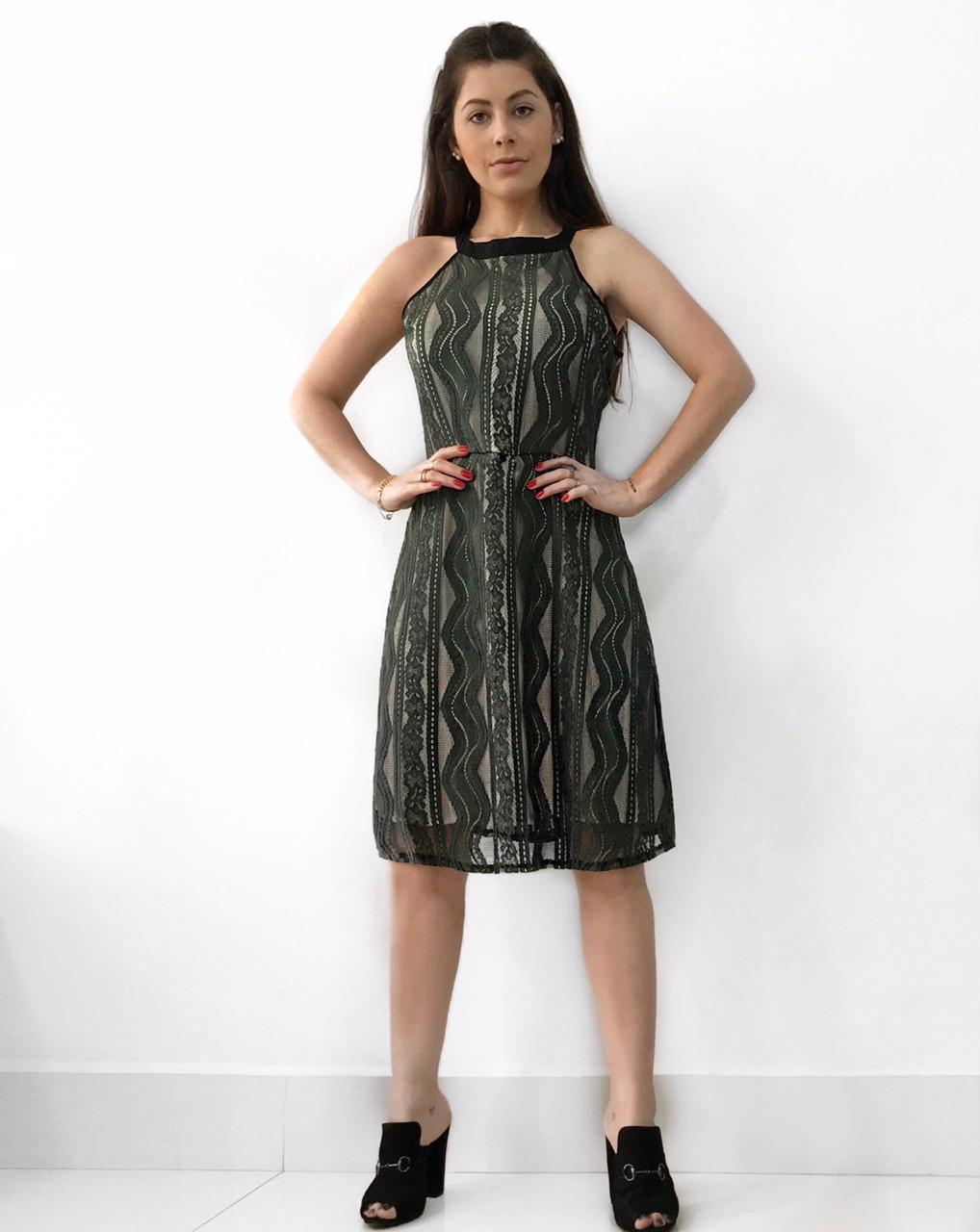 Vestido com forro interno off white e renda verde escura externa, levemente acinturado no modelo elegante e despojado com ziper traseiro . A renda uma tendência que combina com qualquer estação do ano. Disponível tamanho 40/42