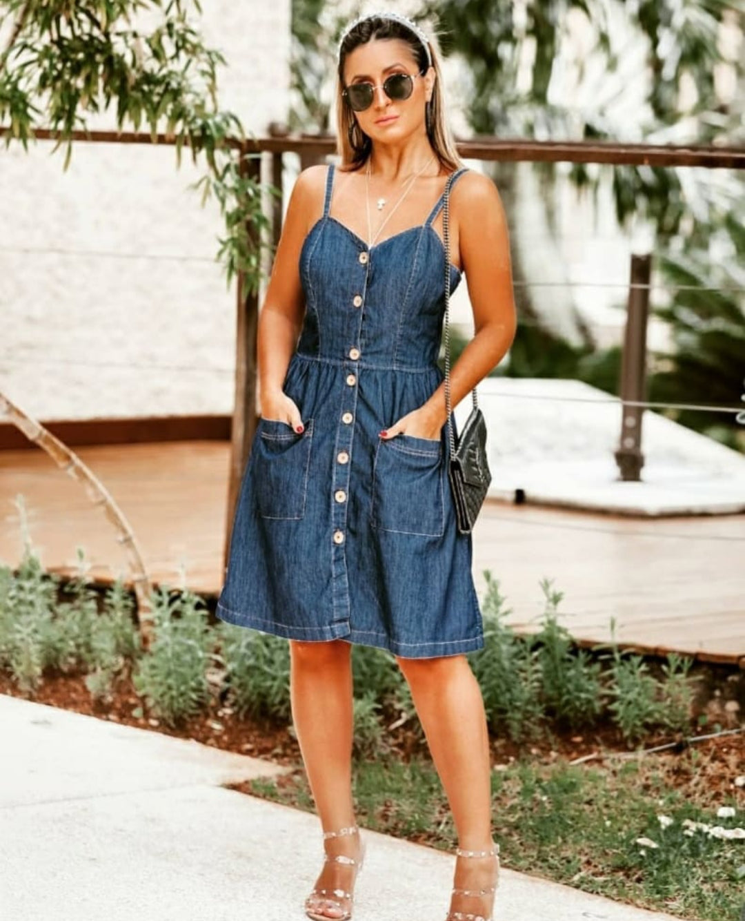 Vestido em jeans sem elastano liocel de alcinha , botões e bolsos.frontais , modelo bem soltinho. Disponível do tamanho P ao GG. Excelente qualidade.