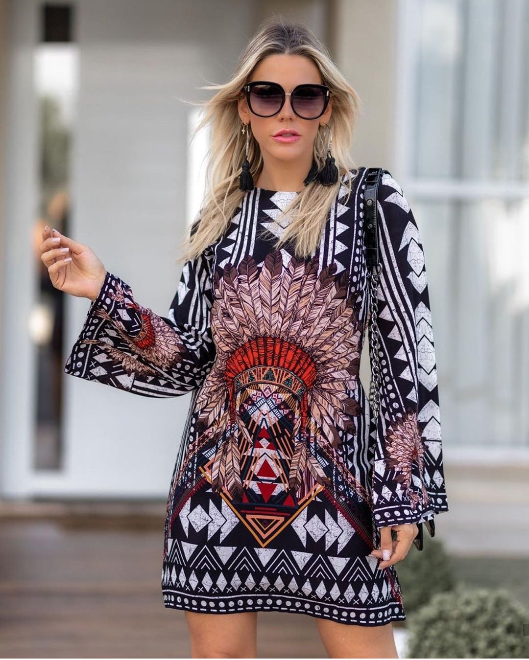 Vestido estilo indiano estampa diferenciada e exclusiva com manga longa flare com detalhe em abertura nas costas que dá um toque super especial e moderno.