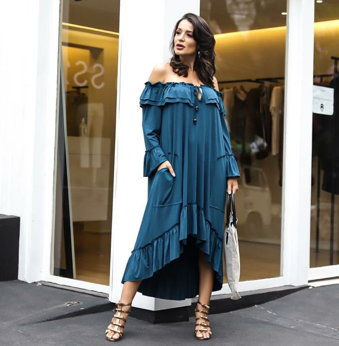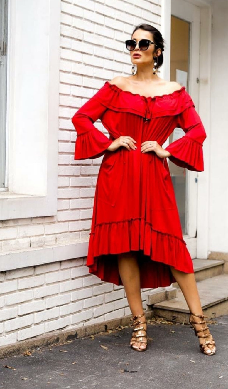 Vestido modelo cigana com bolsos laterais e manga longa , tecido leve e fresco nas  cores  da próxima estação. Viscolycra de caimento perfeito.  Disponível nas cores Tiffany e vermelho  veste do 38 ao 52