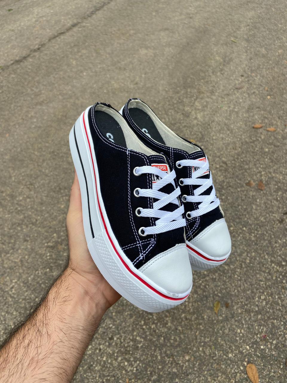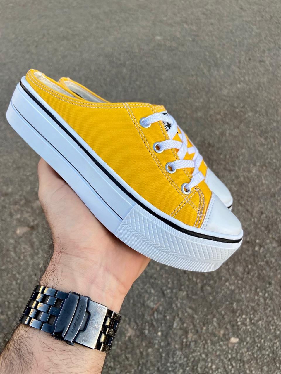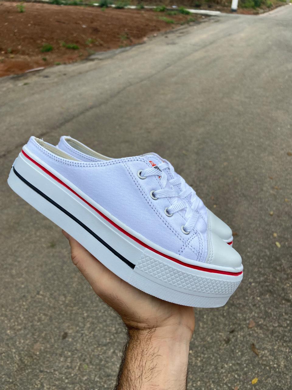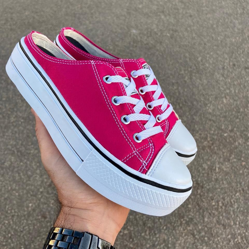 Tênis modelo mulle em lona solado flatform de 6 cm de altura , palmilha grossa confortável , um tênis leve com cadarço para amarração superior. Solado vulcanizado