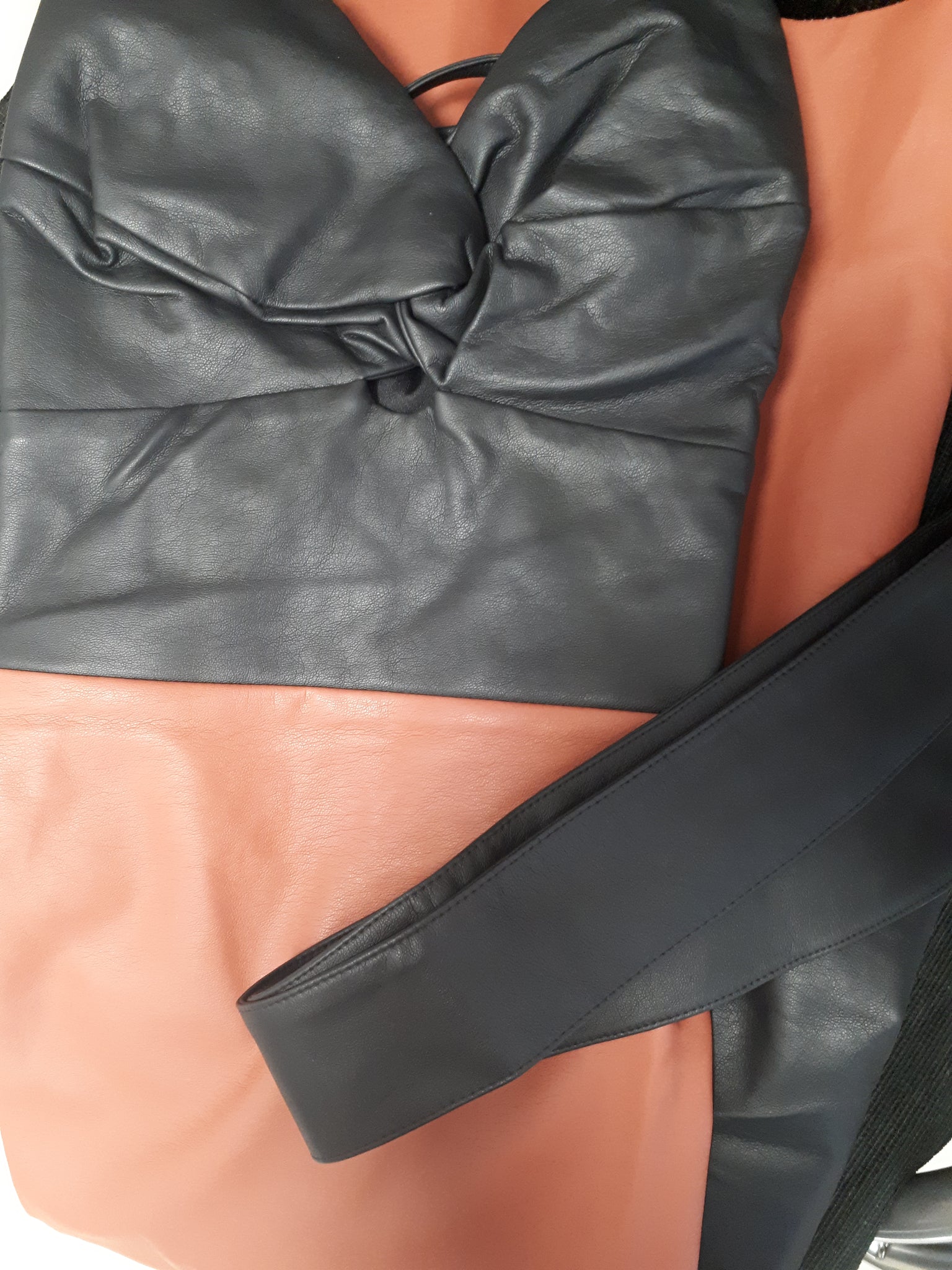 Vestido de alta costura em couro de qualidade super resistente e duradouro. Vestido de corte alongado e cintura alta em duas cores com uma faixa para amarração, um vestido de alça que combina com todas as estações e ocasiões finas e elegante.